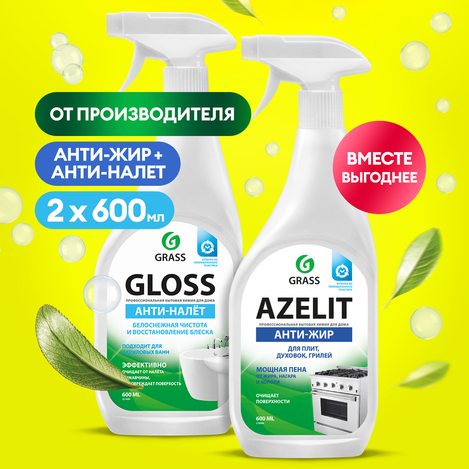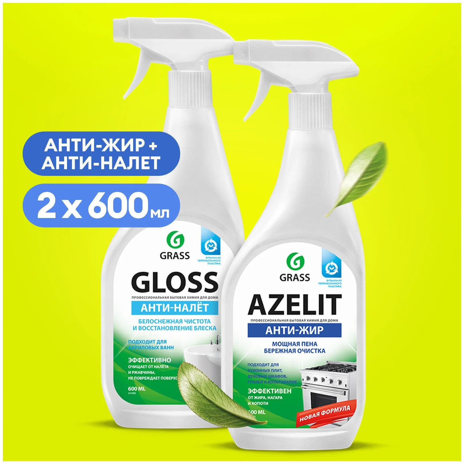 Набор для уборки Грасс чистящие средства Антижир Азелит Azelit 600мл, средство для ванной комнаты Gloss по 600мл интересное: