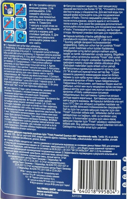 | Дополнительная информация | капсулы для посудомоечной машины Finish Quantum произведены в Польше для внутреннего рынка Европы |