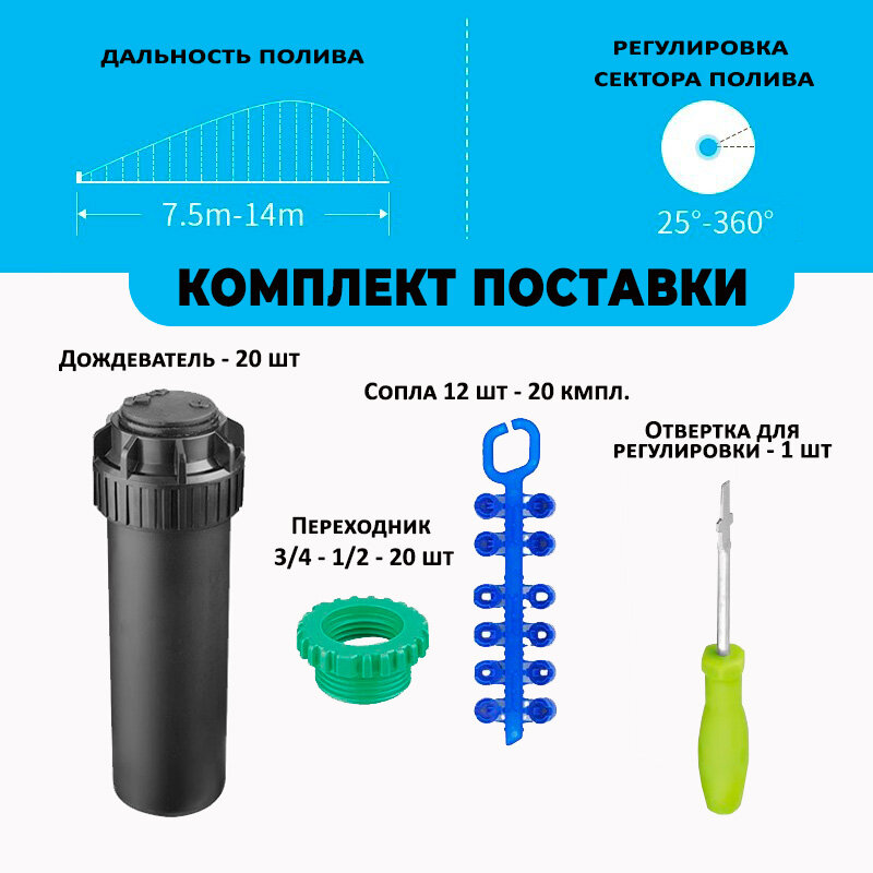 | Комплектация | Дождеватель - 20 шт, Комплект сопел - 20 шт, Переходник 3/4-1/2 - 20 шт, Отвертка для регулировки - 1 шт |