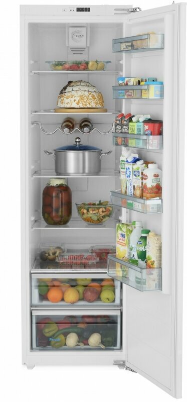 | Плюсы: | Встраиваемый, вместительный. Жёсткое крепление фасадов, бутылочница. Высота полок регулируется газ-лифтом |