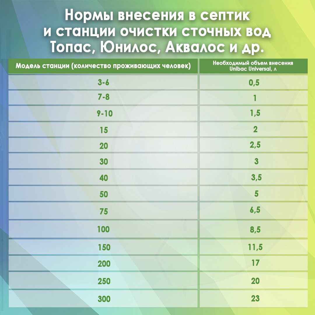 | Дополнительная информация | -выгребная яма: разбавить в 3-5 л воды и влить непосредственно в яму; -дачный туалет: разбавить в 3 л теплой воды и влить непосредственно в дачный туалет; -септики, индивидуальные очистные сооружения разных конструкций: влить, не разбавляя, непосредственно через систему канализации (унитаз); норма расхода: 0,25 л/1 м3 1 раз в 3 месяца или 4 раза в год |