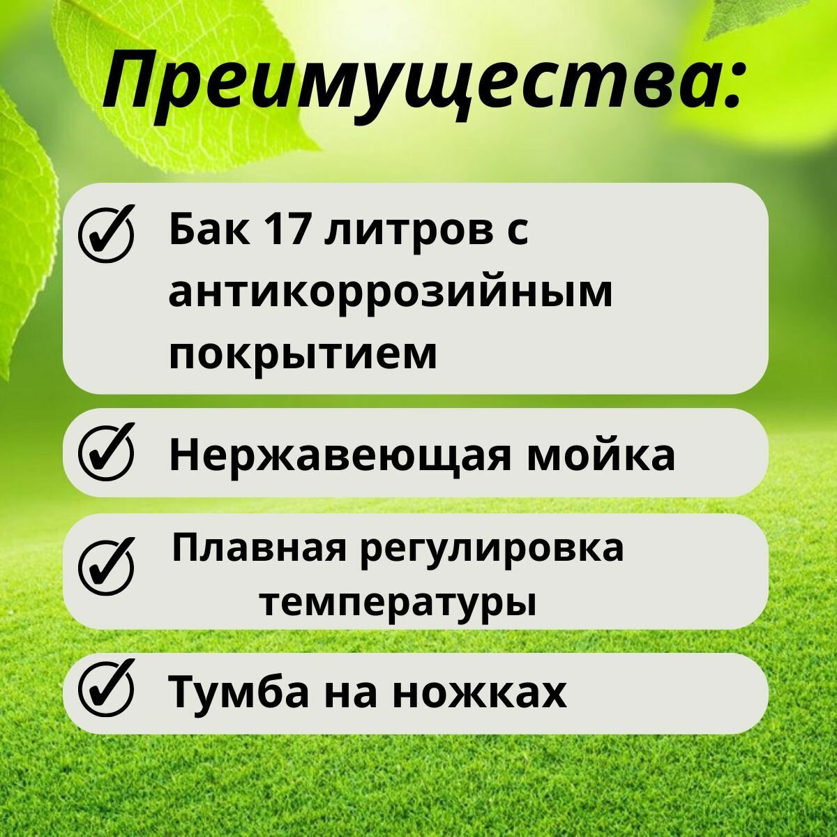 | Особенности | мойка в комплекте, регулировка температуры, с водонагревателем, складная конструкция, тумба в комплекте, шаровый кран |