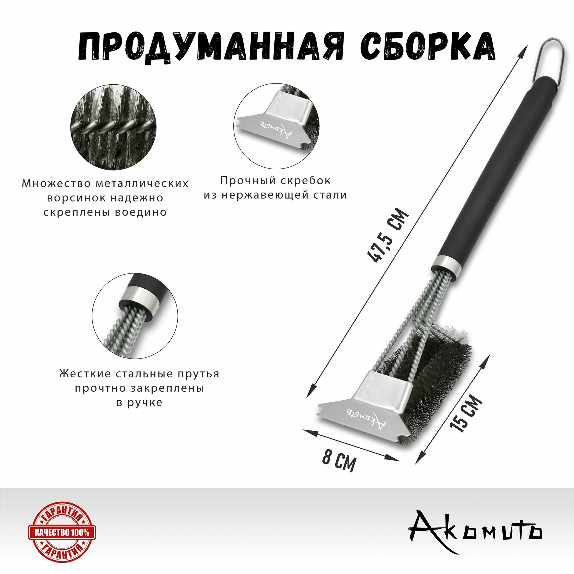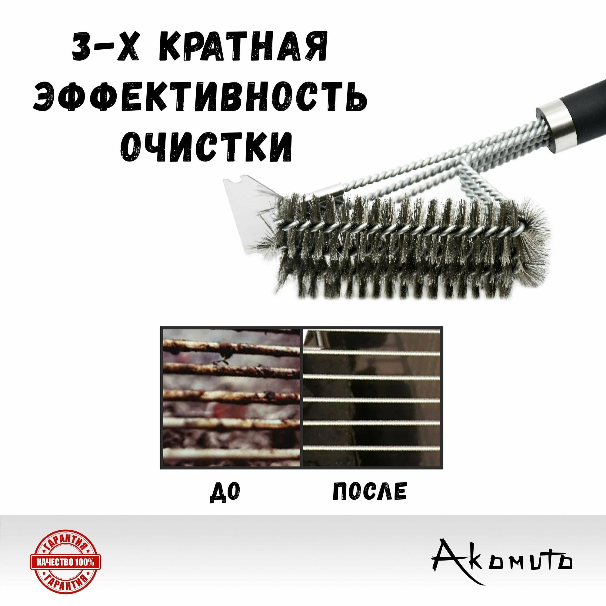 Купить Щетка для гриля, барбекю, шампуров трехрядная со скребком (нержавеющая сталь) длина 45 см, резиновая ручка, Akomuto - оригинал!