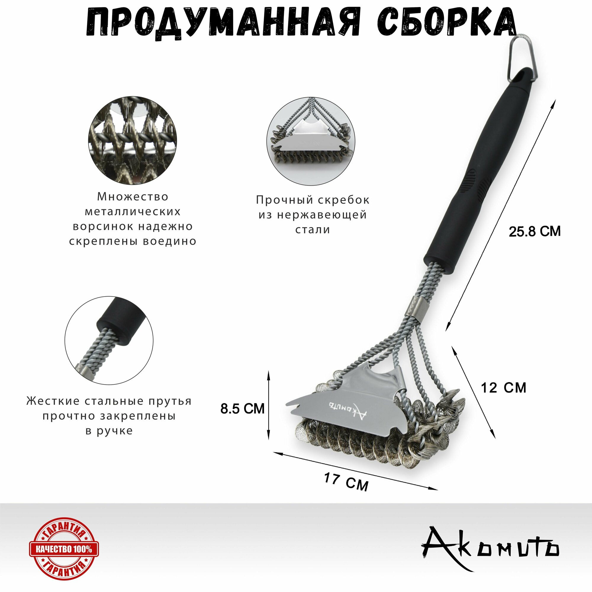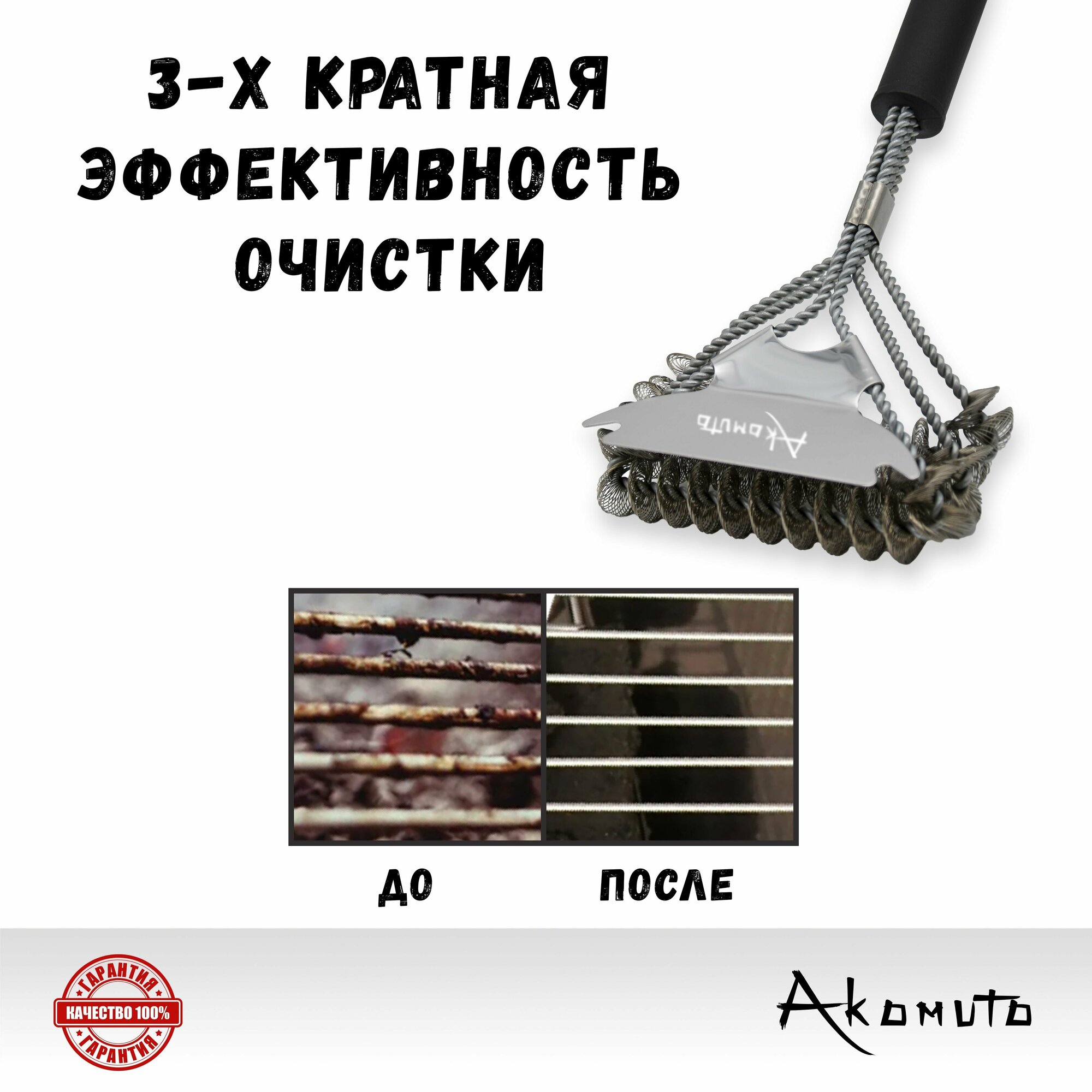 Купить Щетка усиленная для гриля, барбекю, шампуров, трехрядная со скребком (нержавеющая сталь) длина 45 см, резиновая ручка, Akomuto - оригинал!