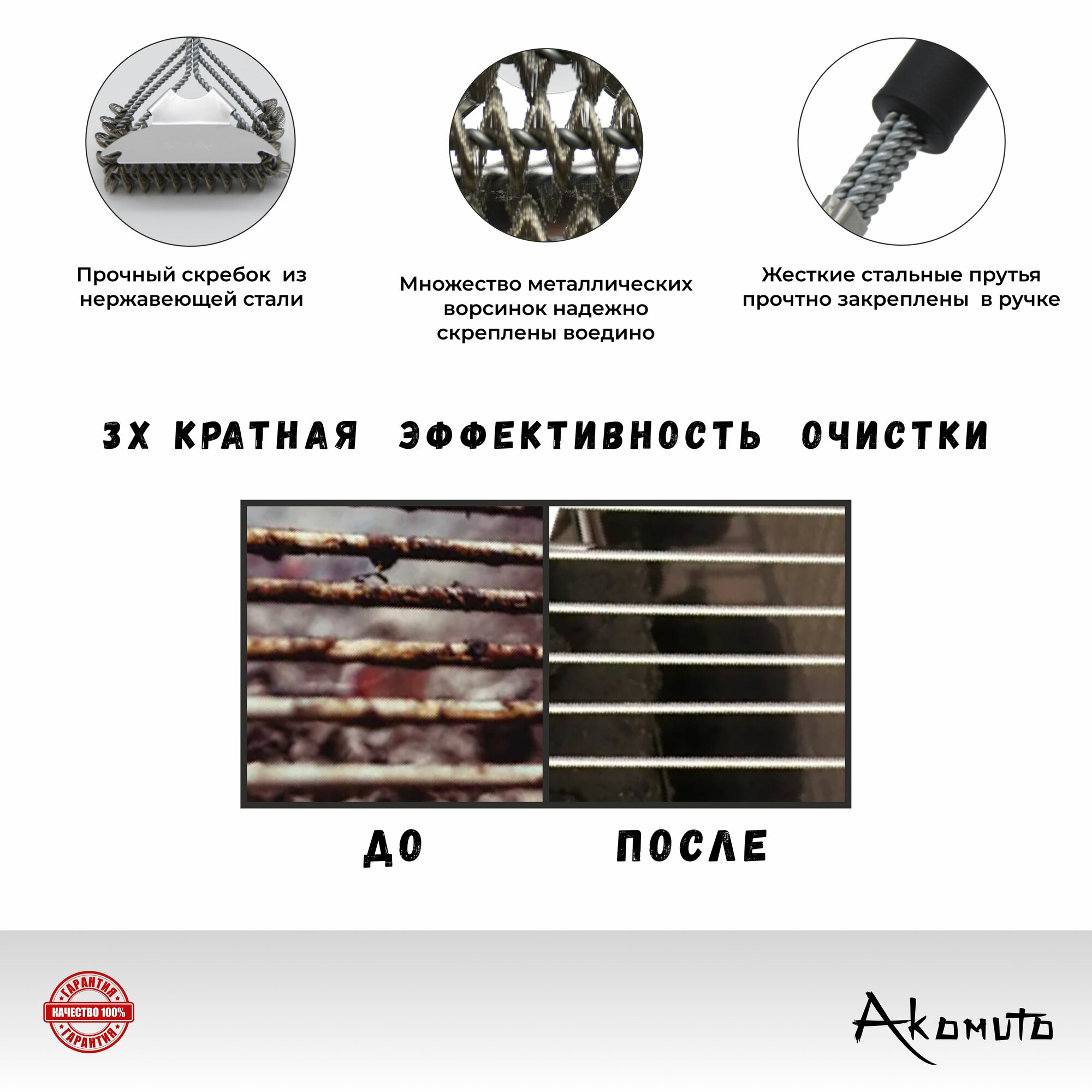 Щетка усиленная для гриля, барбекю, шампуров, трехрядная со скребком (нержавеющая сталь) длина 45 см, резиновая ручка, Akomuto - оригинал!