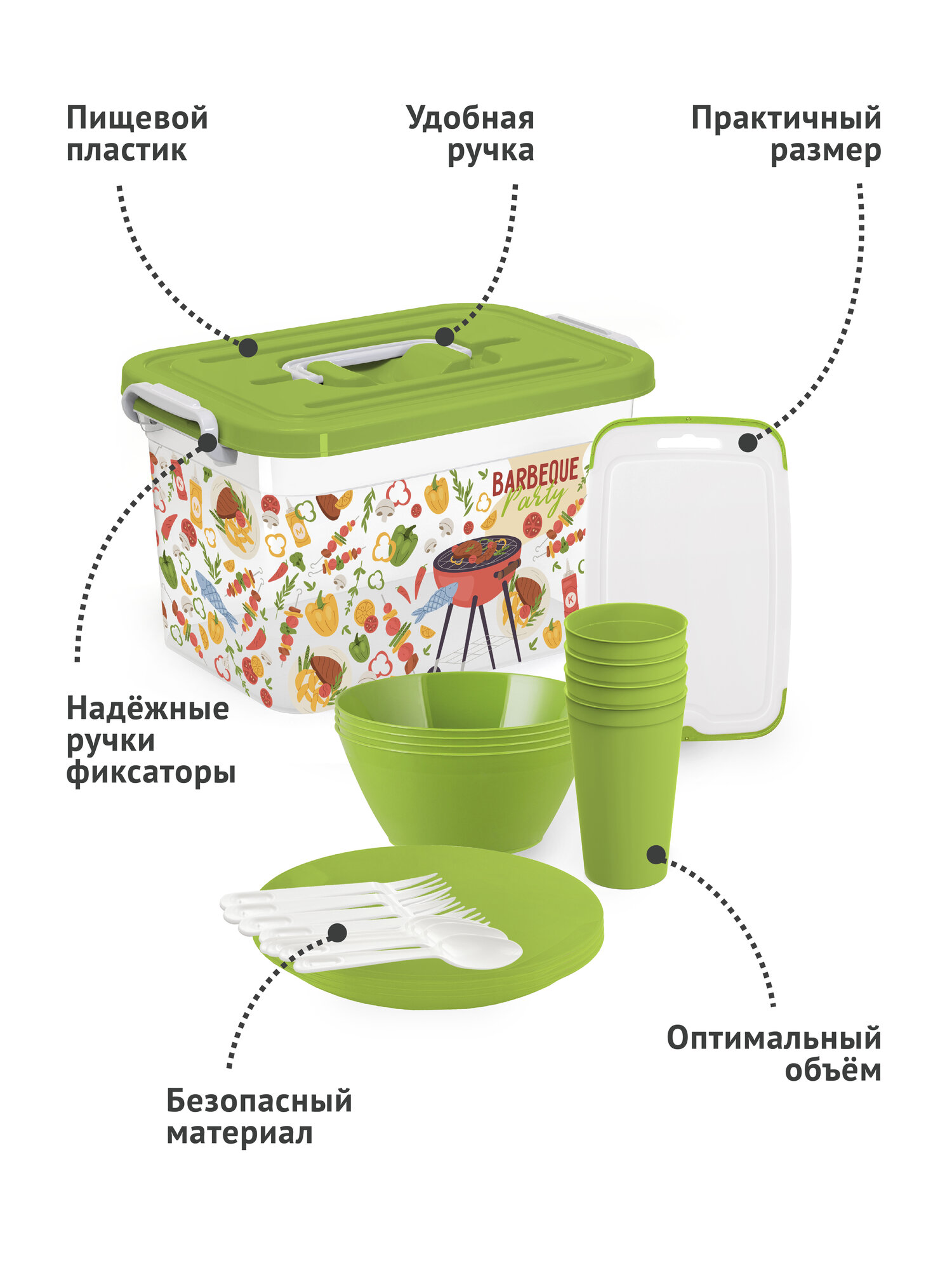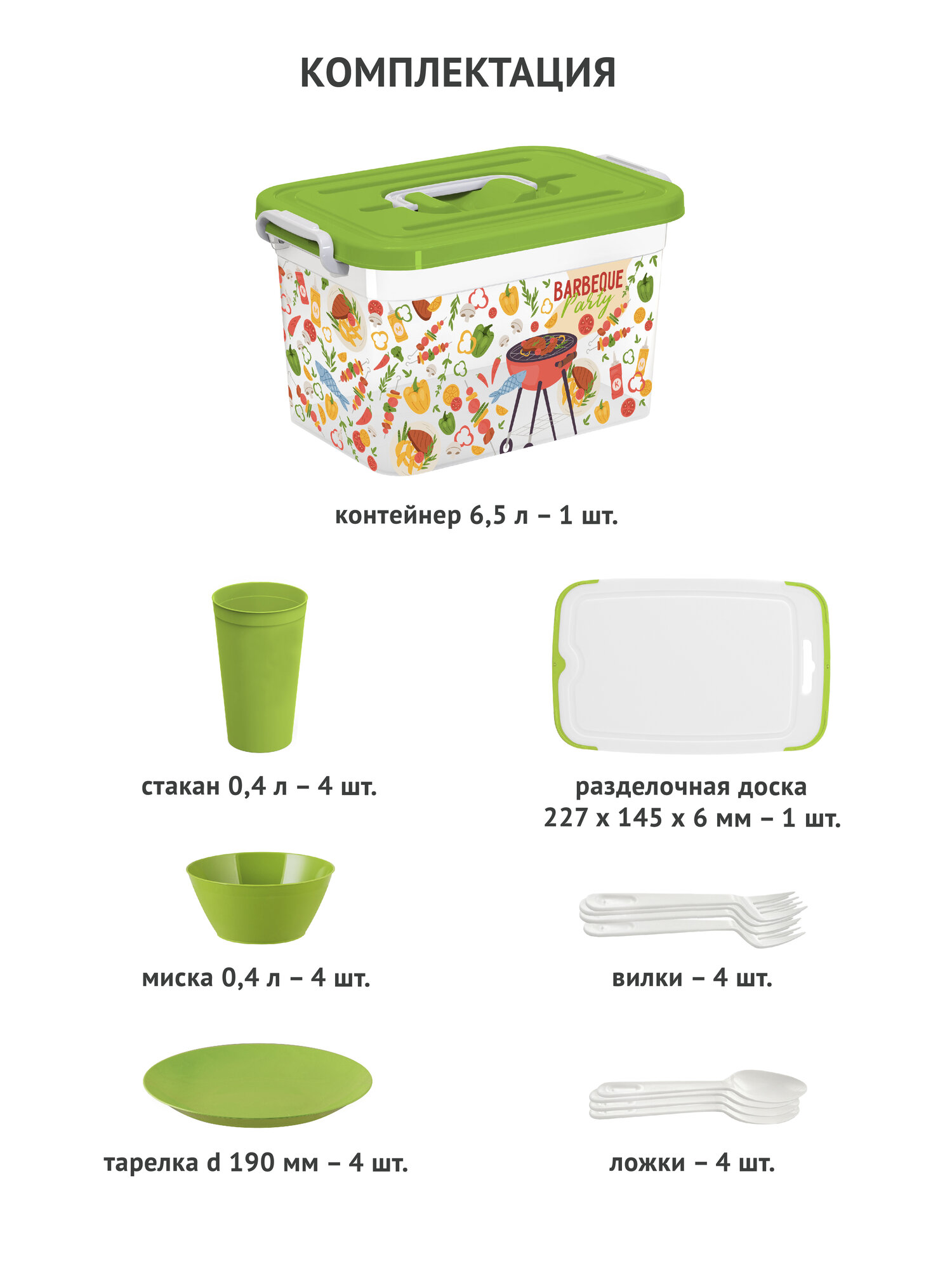 | Комплектация | Контейнер 6,5 л - 1 шт; Стакан 0,4 л - 4 шт; Разделочная доска - 1 шт; Миска 0,4 л - 4 шт; Вилки - 4 шт; Тарелка d 190 мм - 4 шт; Ложки - 4 шт; |