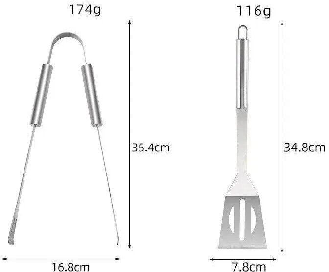 | Длина | вилка для мяса 35 см, лопатка 34.80 см, нож для мяса 32.50 см, щипцы 35.40 см, щетки 34 см |
