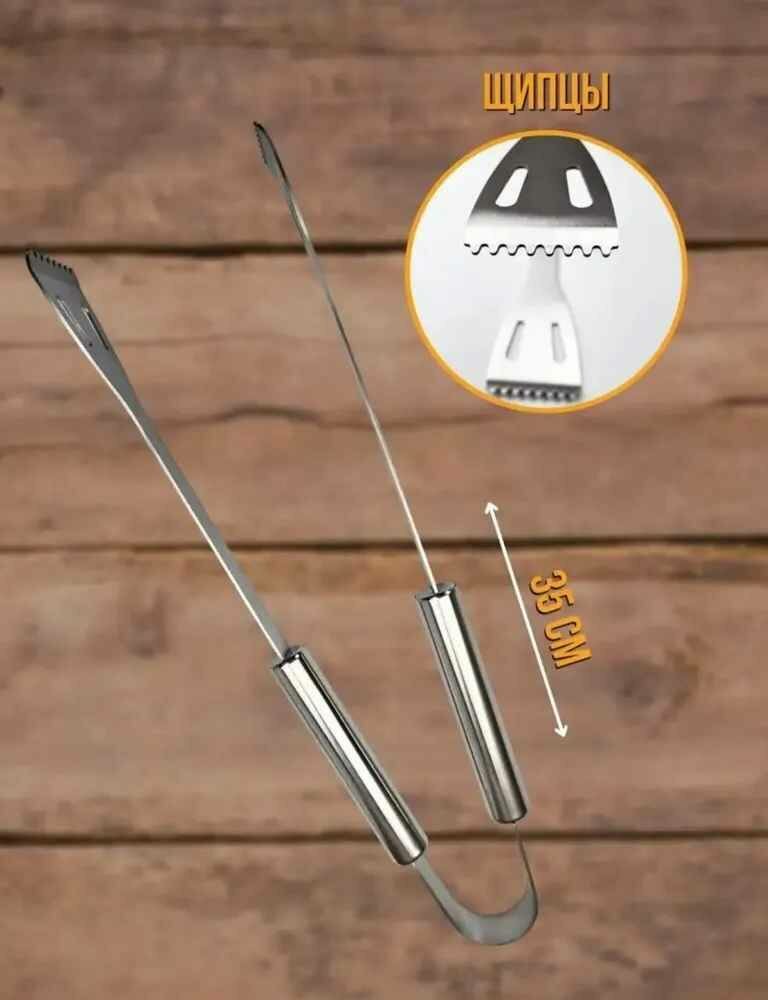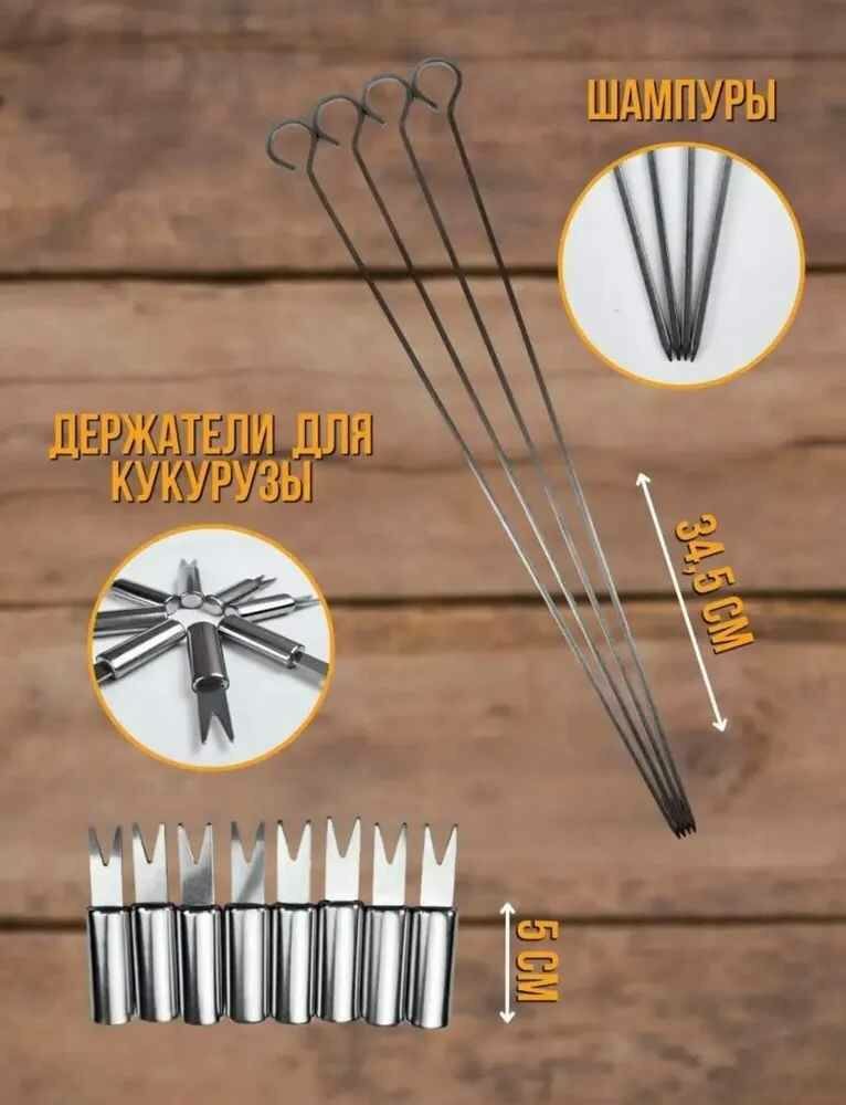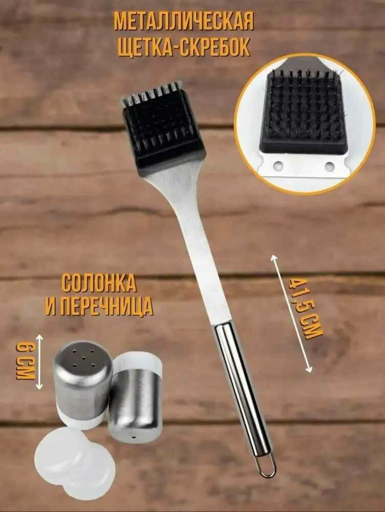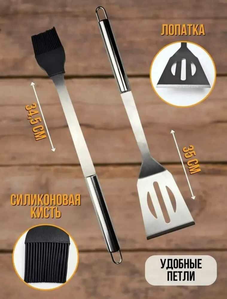 | Длина | мини-вилка 5 см, вилка для мяса 34.50 см, кисточка 34.50 см, лопатка 35 см, нож для мяса 33 см, шампур 35 см, щипцы 35 см, щетки 41.50 см |