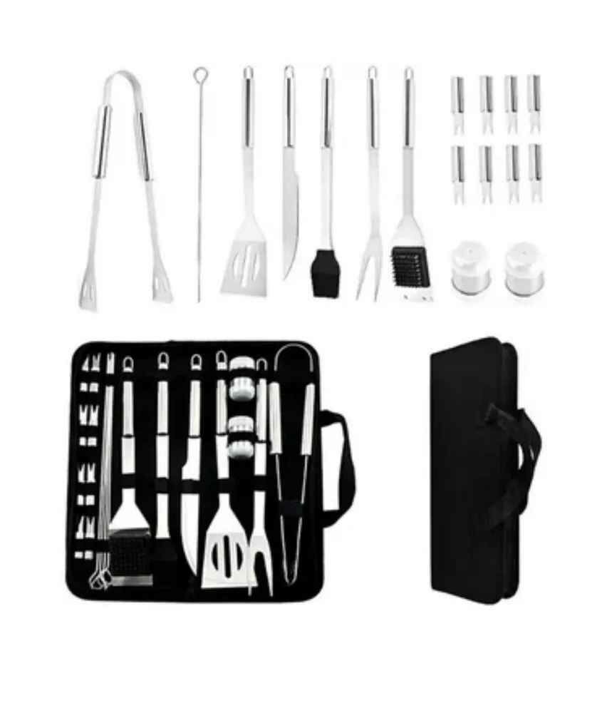 | Комплектация | Сумка, лопатка, вилка, щипцы, кисть, щетка, вилки-держатели, шпажки, перечница, солонка, нож |