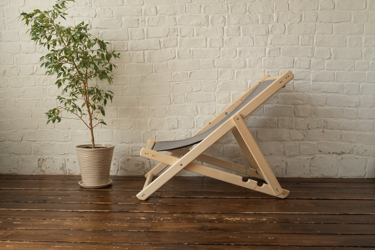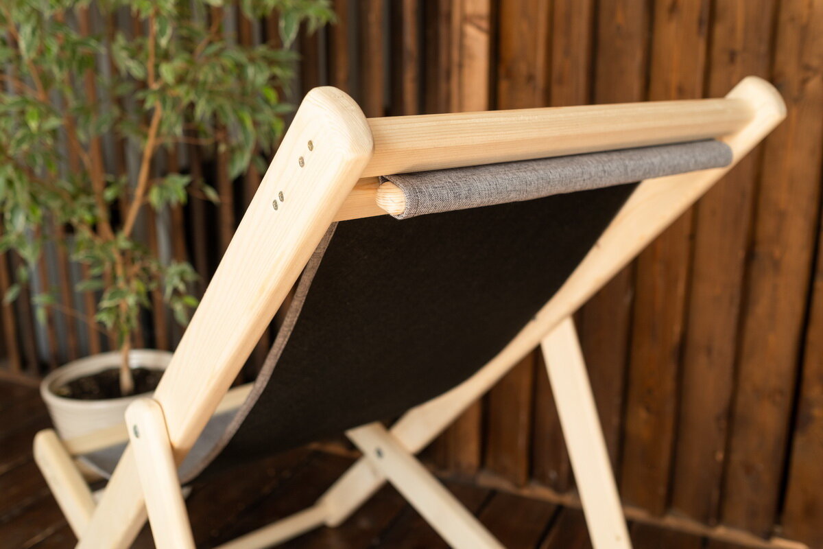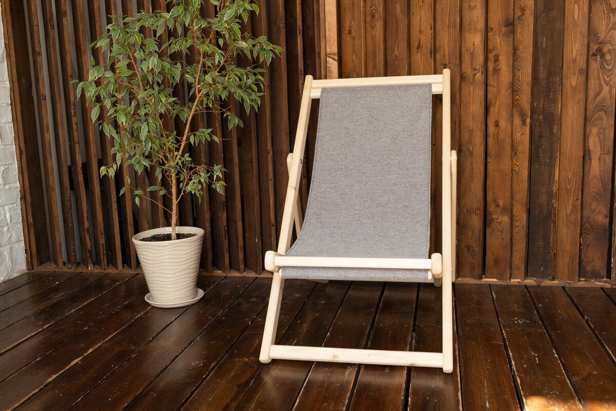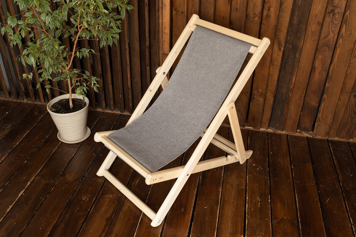 Шезлонг с светло-серой тканью и подлокотниками, деревянный, складной