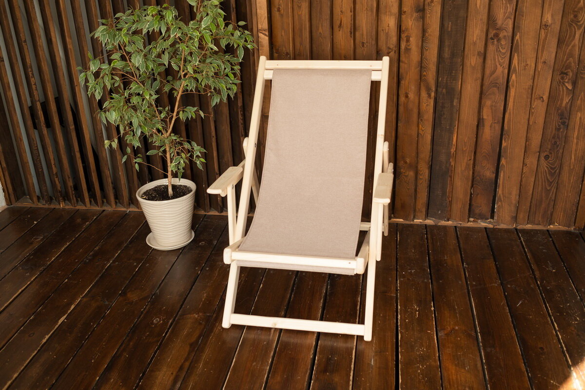 Шезлонг с светло-серой тканью и подлокотниками, деревянный, складной