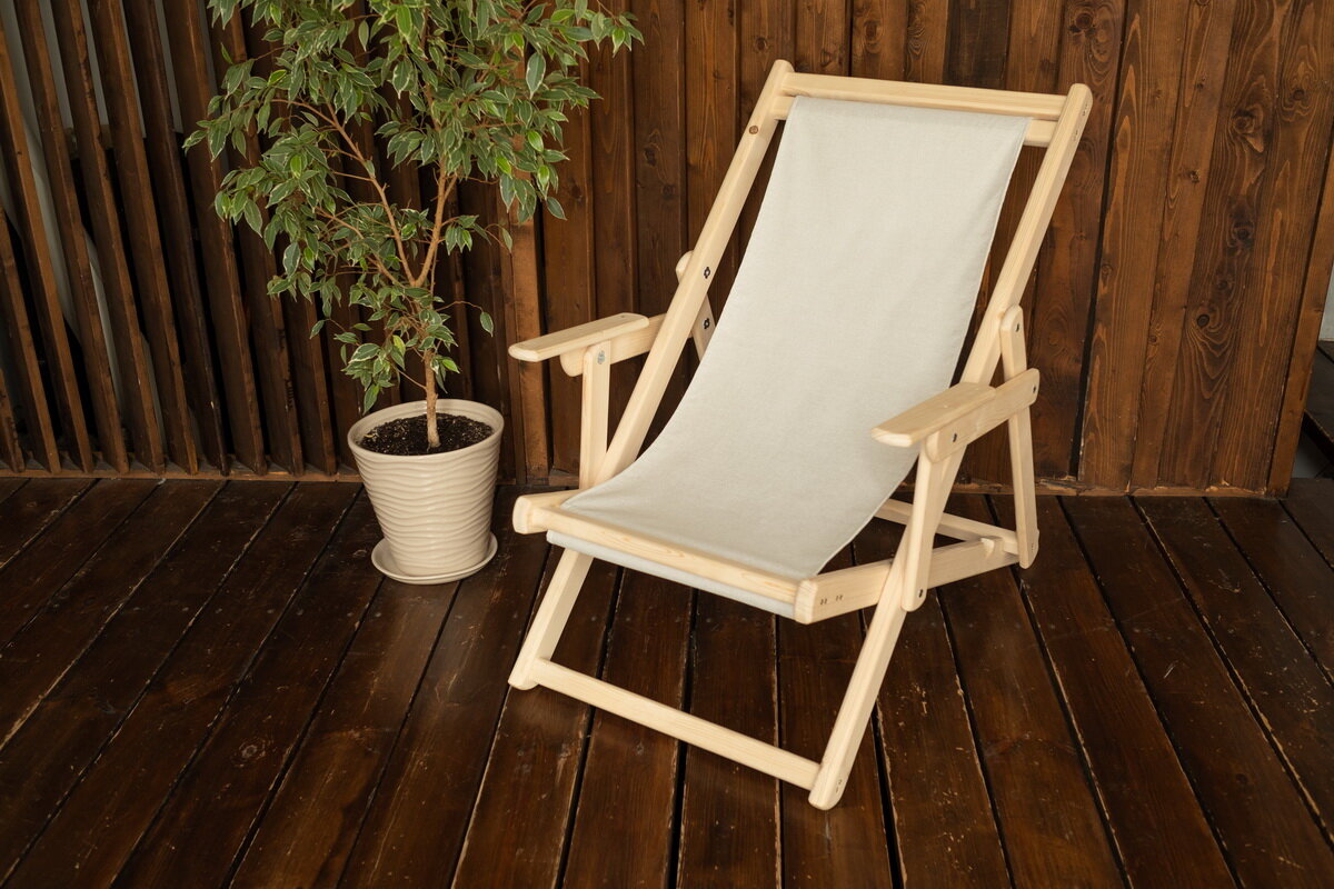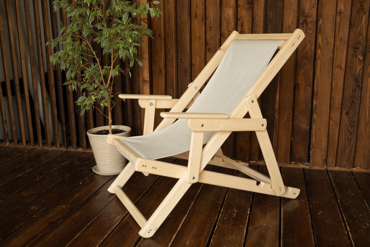 Шезлонг с бежевой тканью и подлокотниками, деревянный, складной