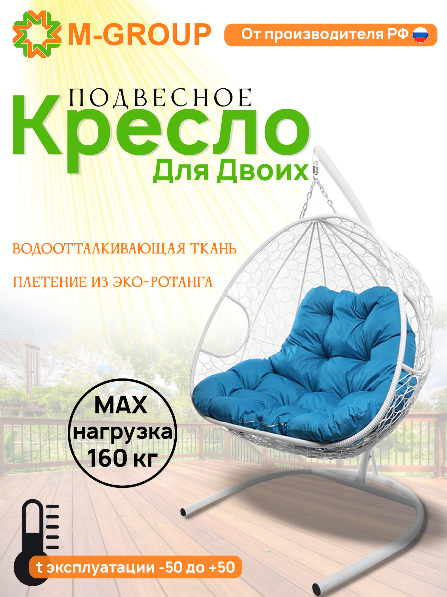 Подвесное кресло кокон двухместное M-group для двоих с ротангом белое+голубая подушка