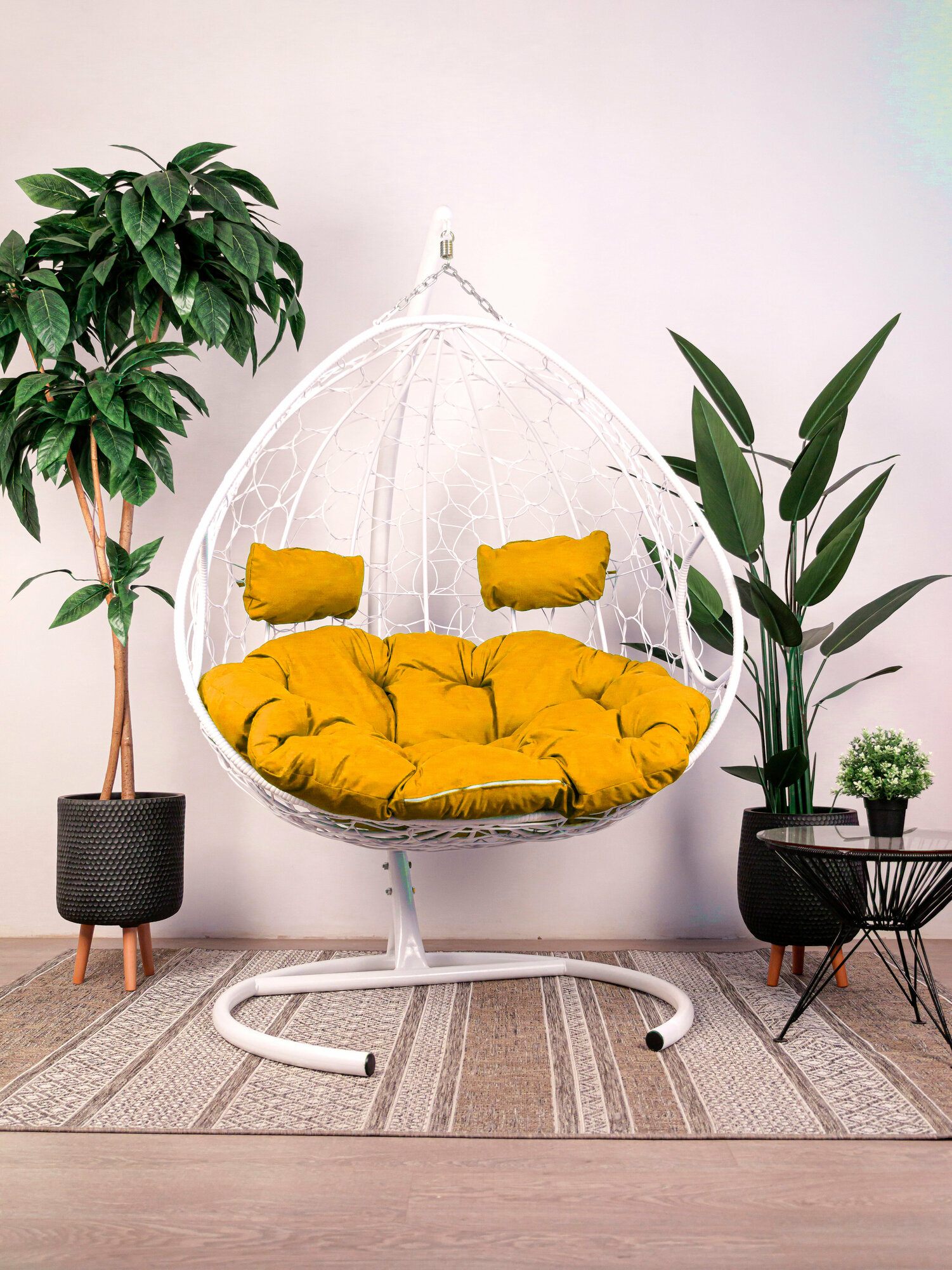 Подвесное кресло M-group для двоих с ротангом белый, жёлтая подушка