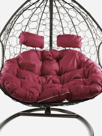 Подвесное кресло M-group для двоих с ротангом коричневое бордовая подушка