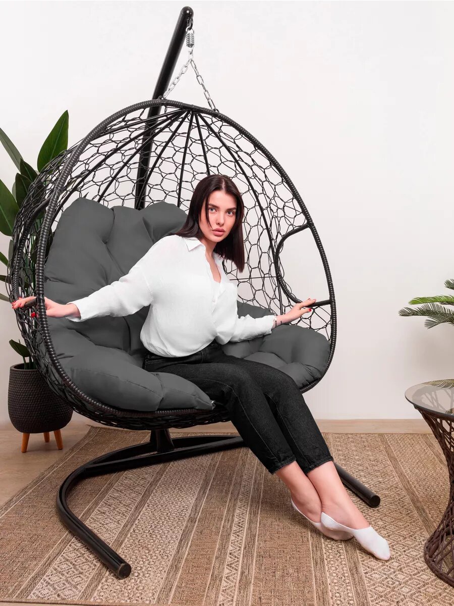 Купить Подвесное кресло из ротанга "Для двоих" черное с серой подушкой M-GROUP