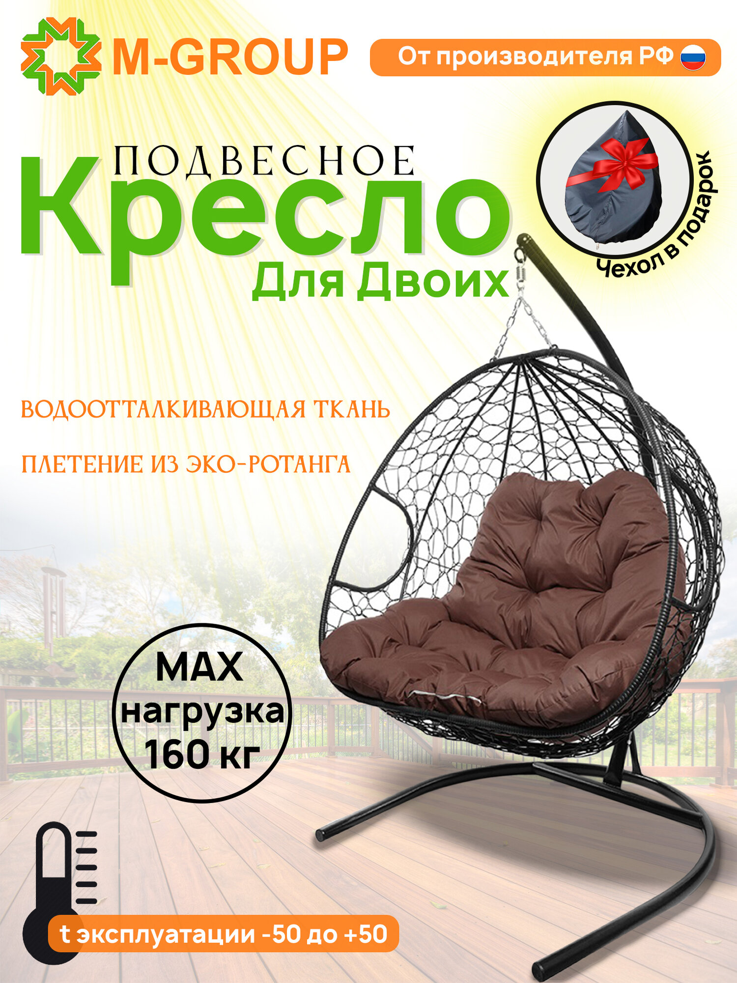 Подвесное кресло с ротангом "Для двоих" черное с коричневой подушкой M-GROUP