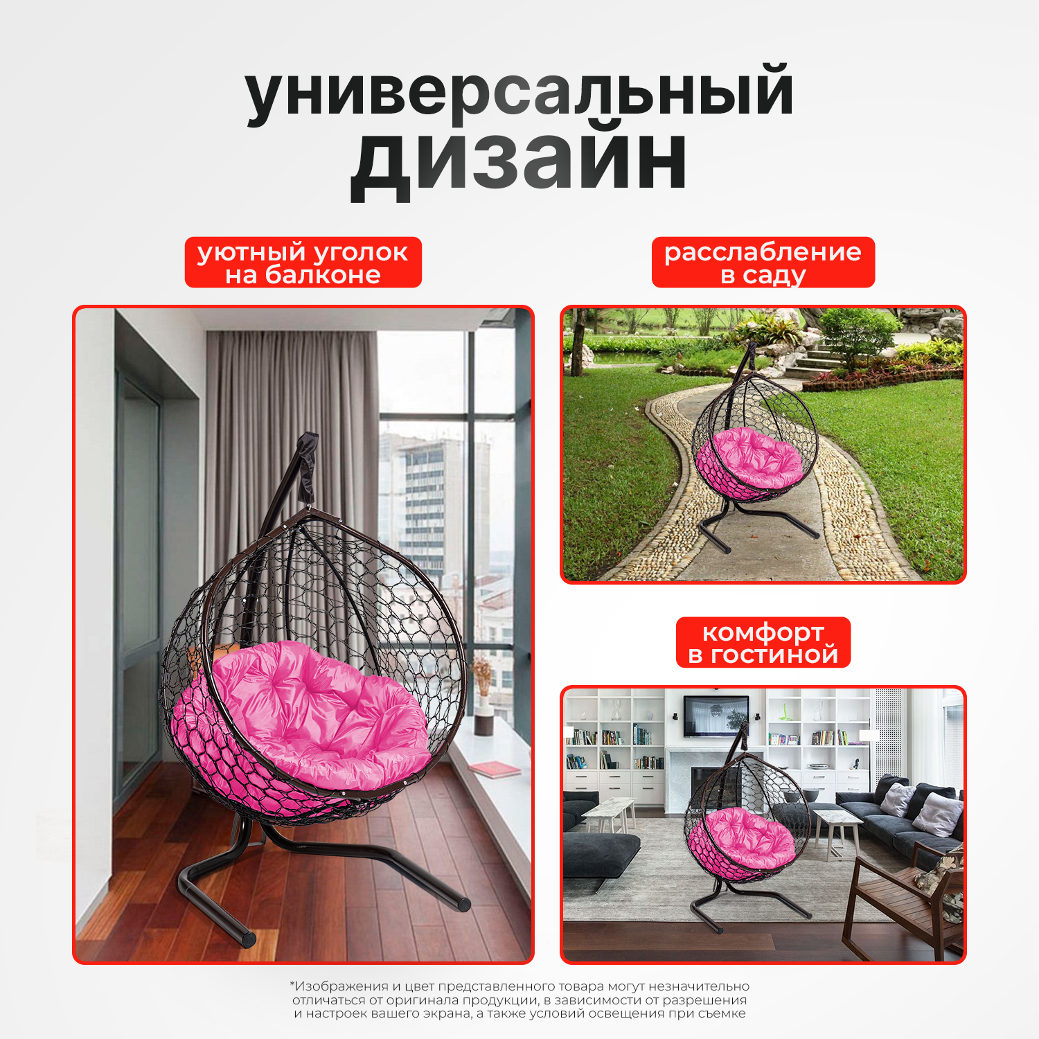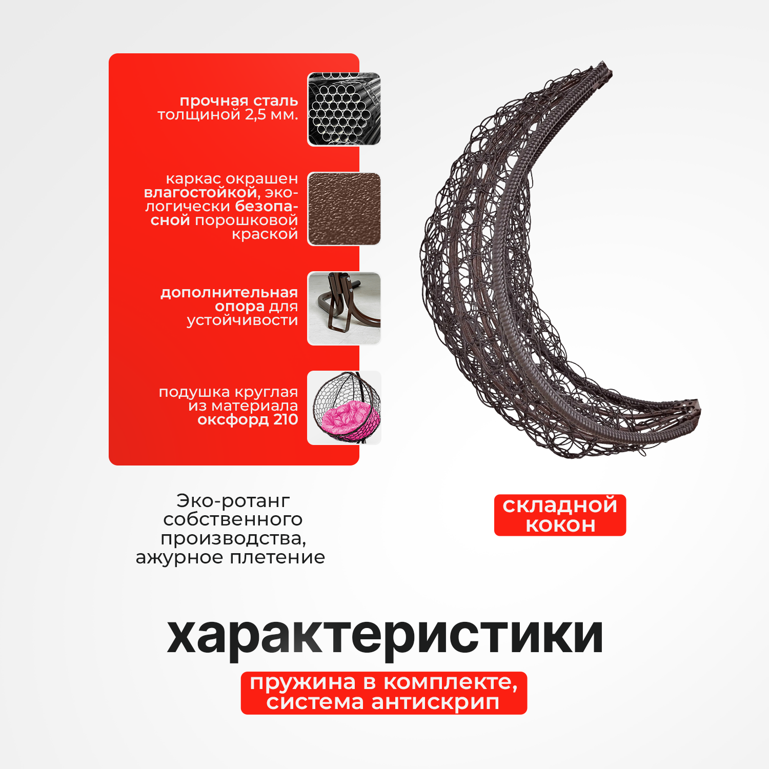 | Комплектация | В комплект входит: 1) Сборно-разборная металлическая стойка. 2) Складной кокон с плетением Ажур. 3) Подушка в виде трапеции. 4) Комплект креплений с S-образными крючками. Изображения и цвет представленного товара могут незначительно отличаться от оригинала продукции, в зависимости от разрешения и настроек вашего экрана, а также условий освещения при съемке. Производитель оставляет за собой право вносить изменения в конструкцию не ухудшающие изделие. |