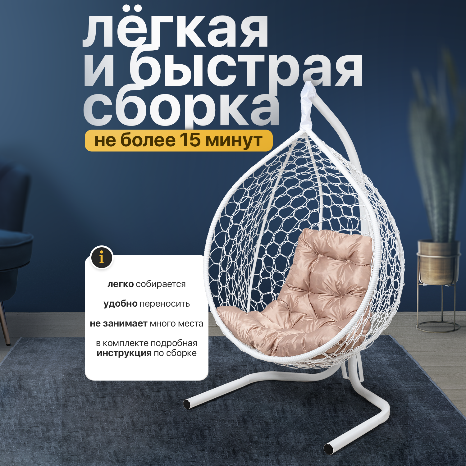 | Комплектация | В комплект входит: 1) Сборно-разборная усиленная металлическая стойка. Основание разборное в форме бабочки обеспечивает устойчивое положение. Конструкция выдерживает максимальную нагрузку до 140 кг. Высота стойки - 160 см. 2) Складной кокон с плетением Ажур. Кокон оплетается вручную собственным ротангом. Размеры кокона: Высота-100 +-3 см, Ширина -100 +-3см, Глубина - 63 +-3 см 3) Подушка в форме трапеции, плотно набитая Холлофайбером- поролон, который служит 3-4 дольше и сохранит свою форму. Материал чехла подушки - Оксфорд, влагоотталкивающая ткань. 4) Комплект креплений. |