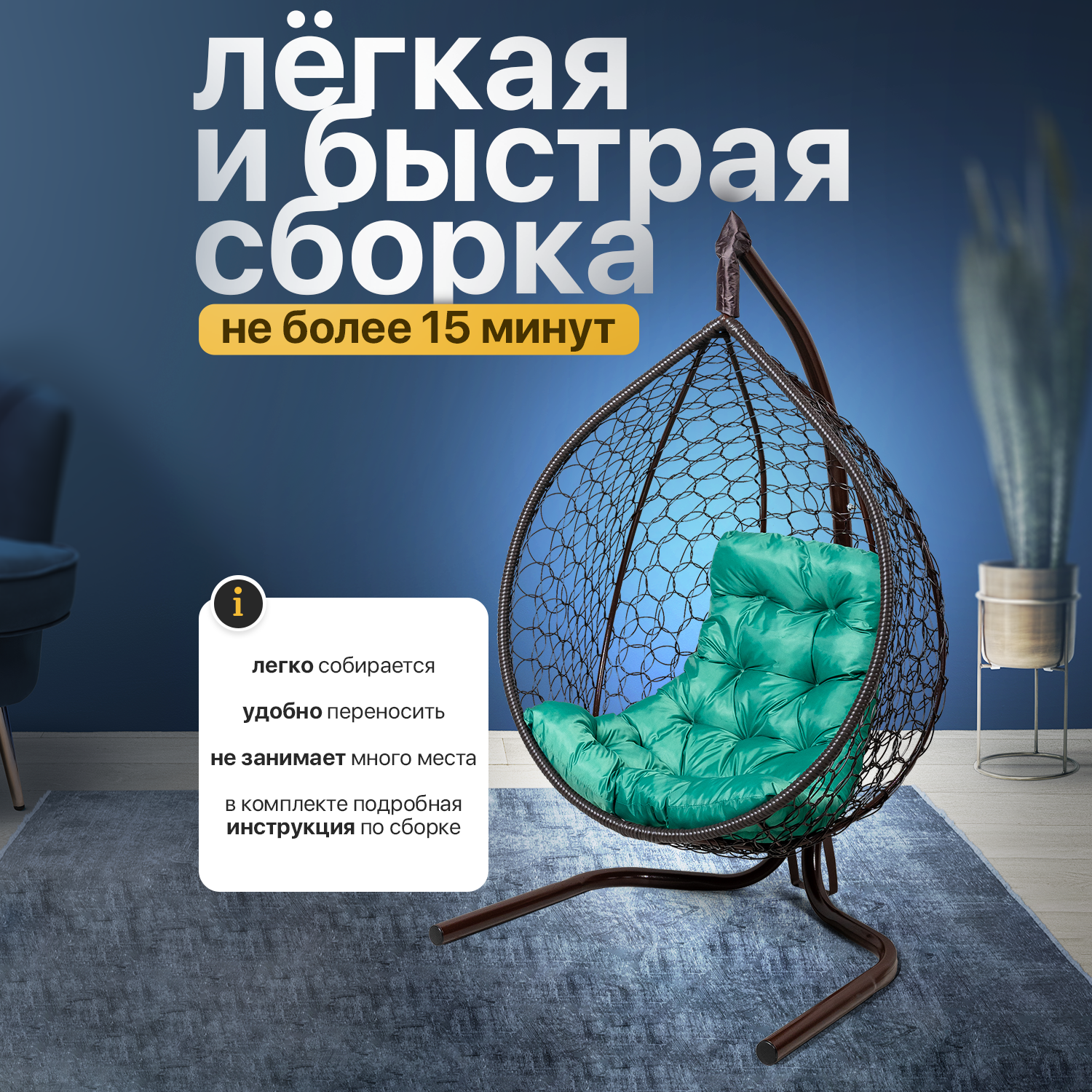 | Комплектация | В комплект входит: 1) Сборно-разборная усиленная металлическая стойка. Основание разборное в форме бабочки обеспечивает устойчивое положение. Конструкция выдерживает максимальную нагрузку до 140 кг. Высота стойки - 160 см. 2) Складной кокон с плетением Ажур. Кокон оплетается вручную собственным ротангом. Размеры кокона: Высота-100 +-3 см, Ширина -100 +-3см, Глубина - 63 +-3 см 3) Подушка в форме трапеции, плотно набитая Холлофайбером- поролон, который служит 3-4 дольше и сохранит свою форму. Материал чехла подушки - Оксфорд, влагоотталкивающая ткань. 4) Комплект креплений. |