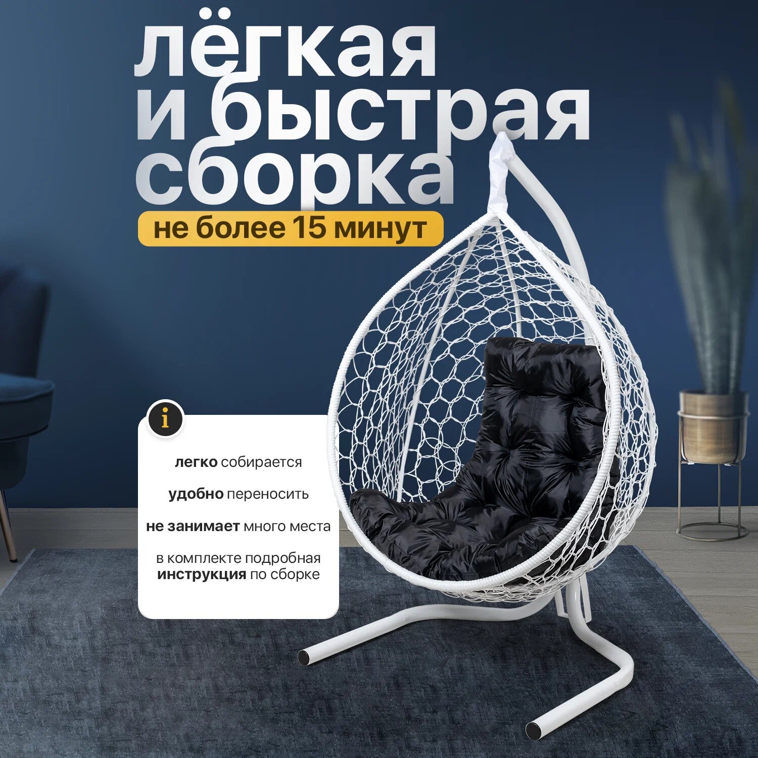 | Комплектация | В комплект входит: 1) Сборно-разборная усиленная металлическая стойка. Основание разборное в форме бабочки обеспечивает устойчивое положение. Конструкция выдерживает максимальную нагрузку до 140 кг. Высота стойки - 160 см. 2) Складной кокон с плетением Ажур. Кокон оплетается вручную собственным ротангом. Размеры кокона: Высота-100 +-3 см, Ширина -100 +-3см, Глубина - 63 +-3 см 3) Подушка в форме трапеции, плотно набитая Холлофайбером- поролон, который служит 3-4 дольше и сохранит свою форму. Материал чехла подушки - Оксфорд, влагоотталкивающая ткань. 4) Комплект креплений. |