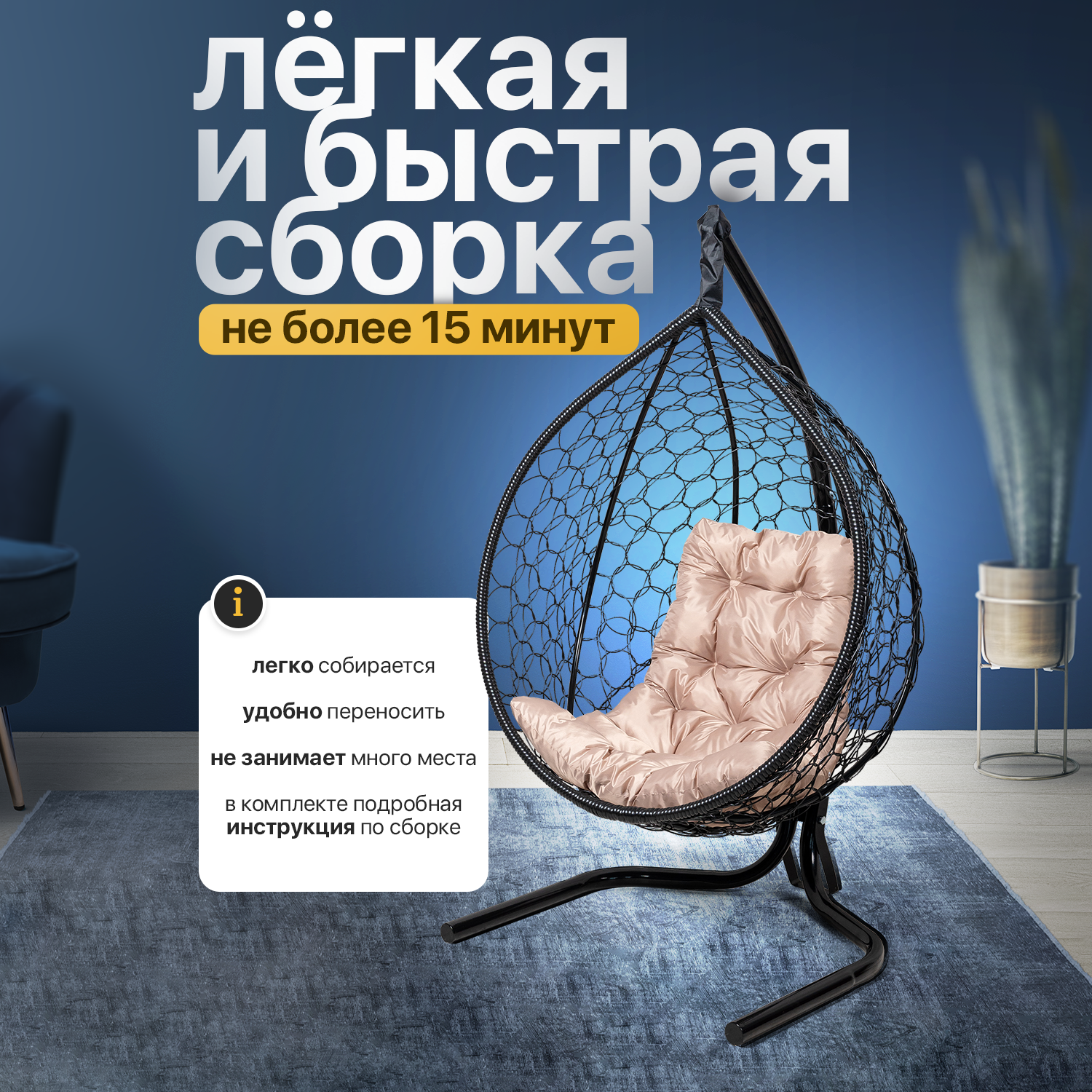 | Комплектация | В комплект входит: 1) Сборно-разборная усиленная металлическая стойка. Основание разборное в форме бабочки обеспечивает устойчивое положение. Конструкция выдерживает максимальную нагрузку до 140 кг. Высота стойки - 160 см. 2) Складной кокон с плетением Ажур. Кокон оплетается вручную собственным ротангом. Размеры кокона: Высота-100 +-3 см, Ширина -100 +-3см, Глубина - 63 +-3 см 3) Подушка в форме трапеции, плотно набитая Холлофайбером- поролон, который служит 3-4 дольше и сохранит свою форму. Материал чехла подушки - Оксфорд, влагоотталкивающая ткань. 4) Комплект креплений. |