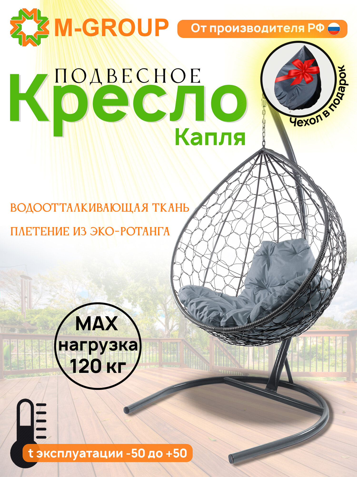 Подвесное кресло из ротанга "Капля" серое с серой подушкой M-Group