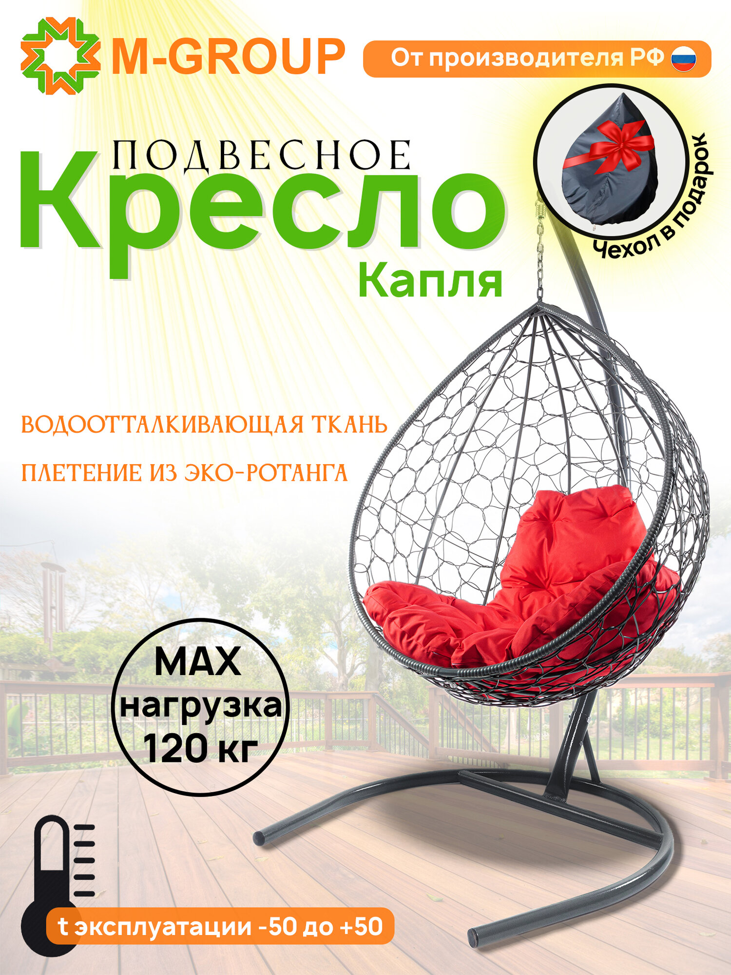 | Дополнительная информация | Плетение кресла усовершенствовано и отличается от представленного на сайте. Размер подвесной части - капли: 98х72х105 см. |