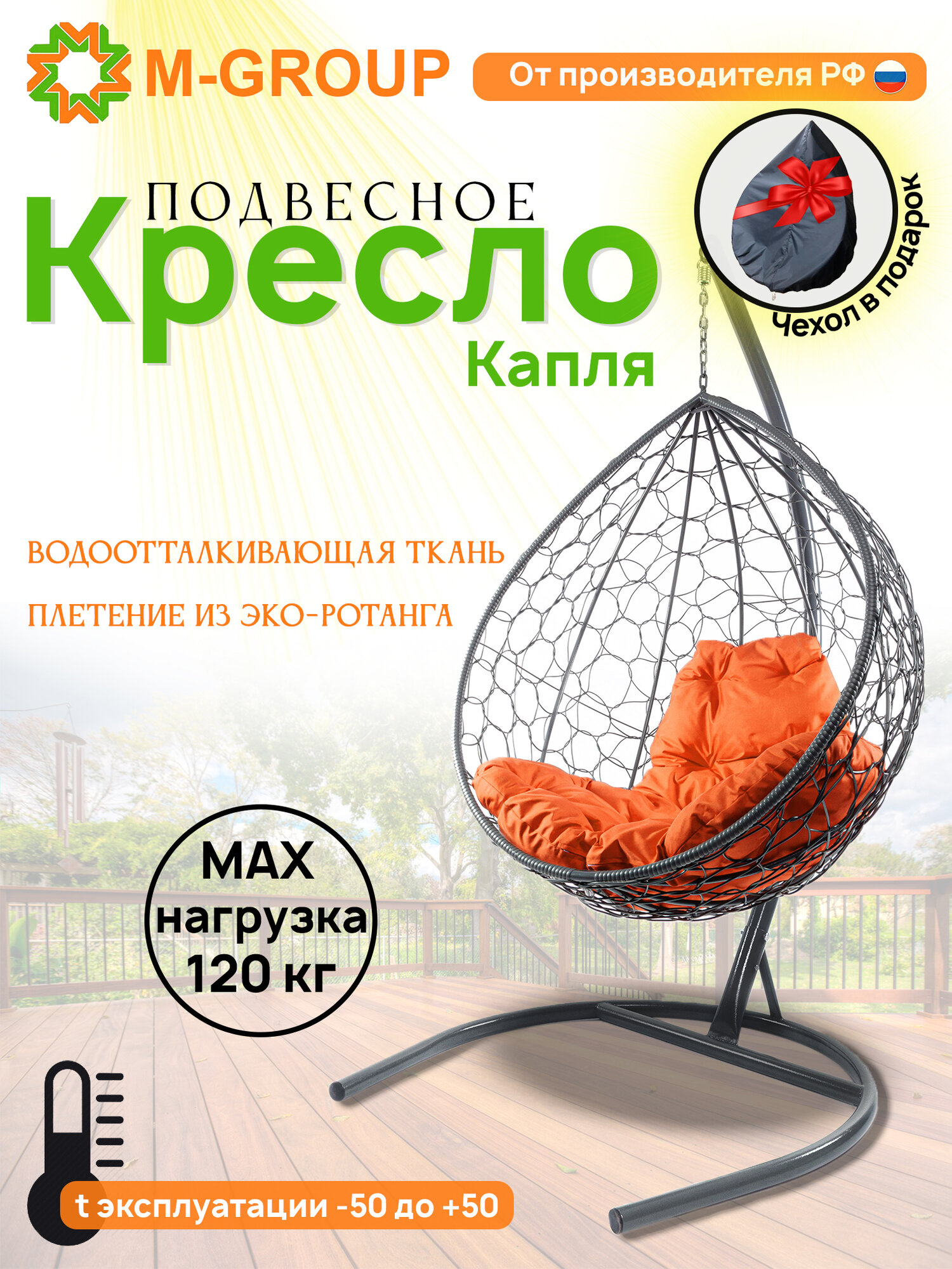 Подвесное кресло M-group капля складной, с ротангом серое оранжевая подушка