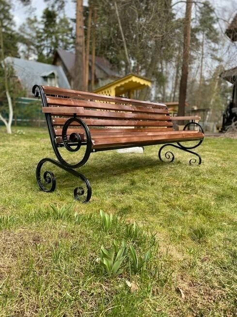 Скамейка садовая Классика с деревянными спинкой и сиденьем без покраски, лавочка для дачи с металлическим каркасом