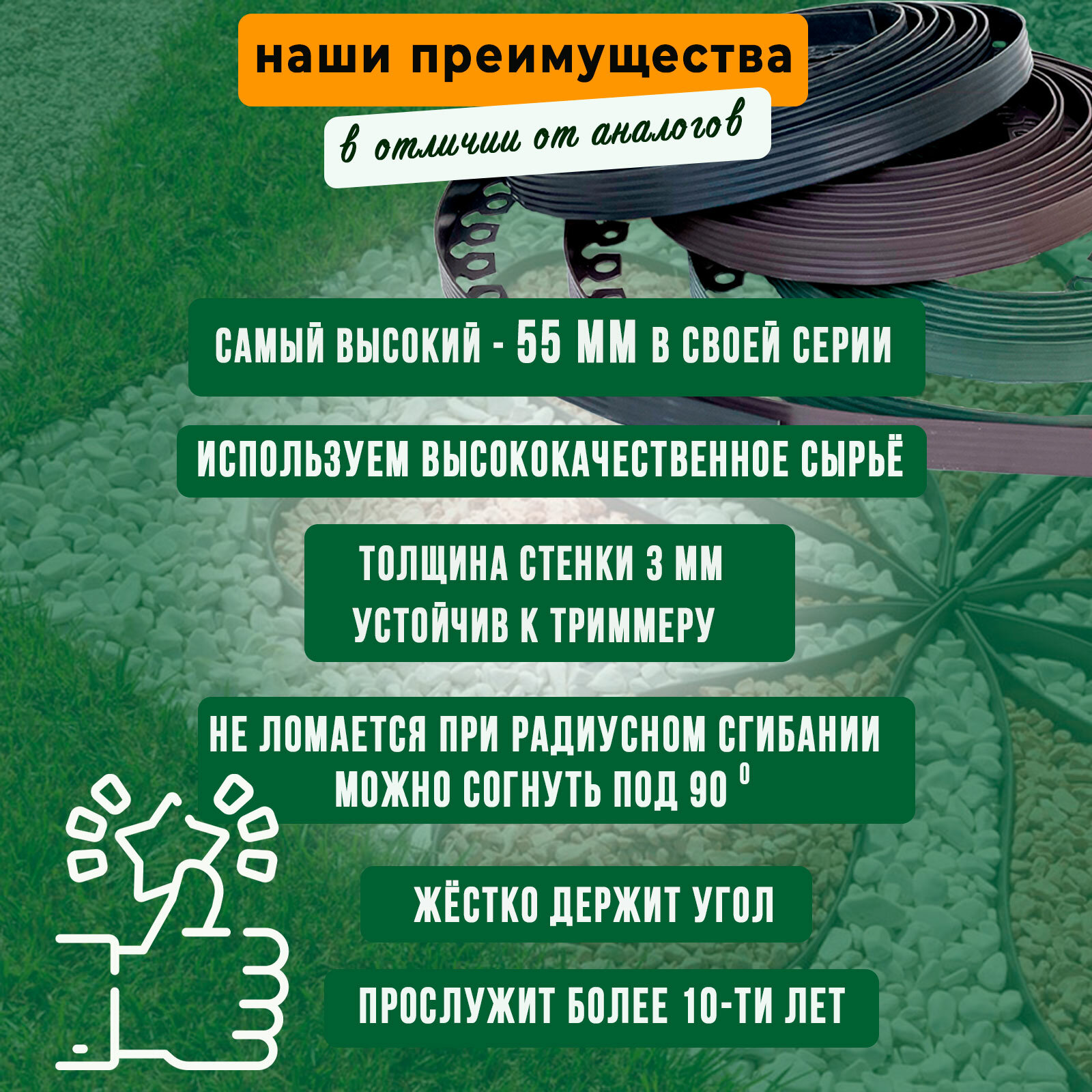 Бордюр садовый пластиковый Манго для дачи высота 55 мм длина 10 метров зеленый
