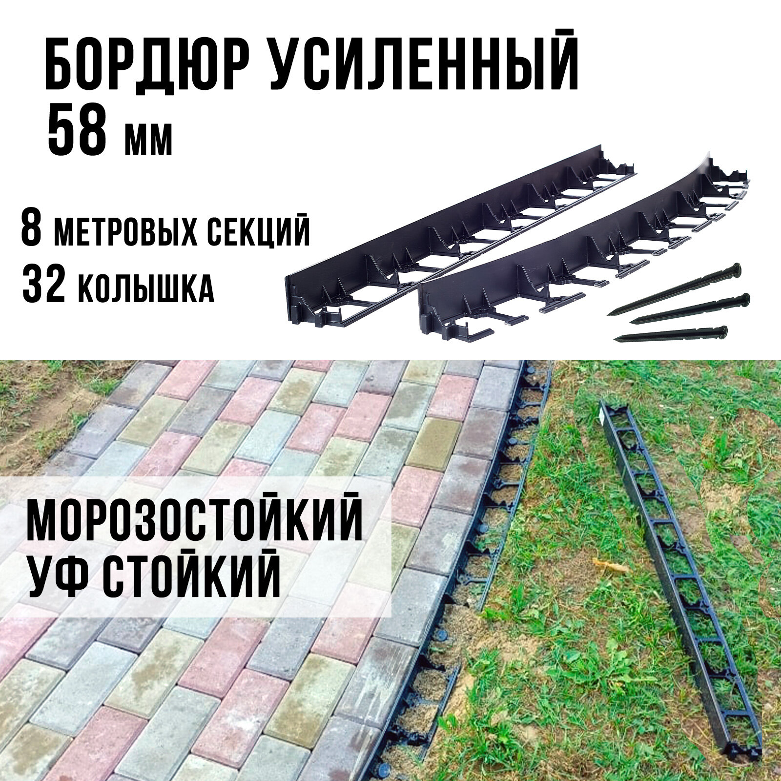 Бордюр садовый пластиковый для дачи 8 метров с кольями высота 58 мм цвет черный