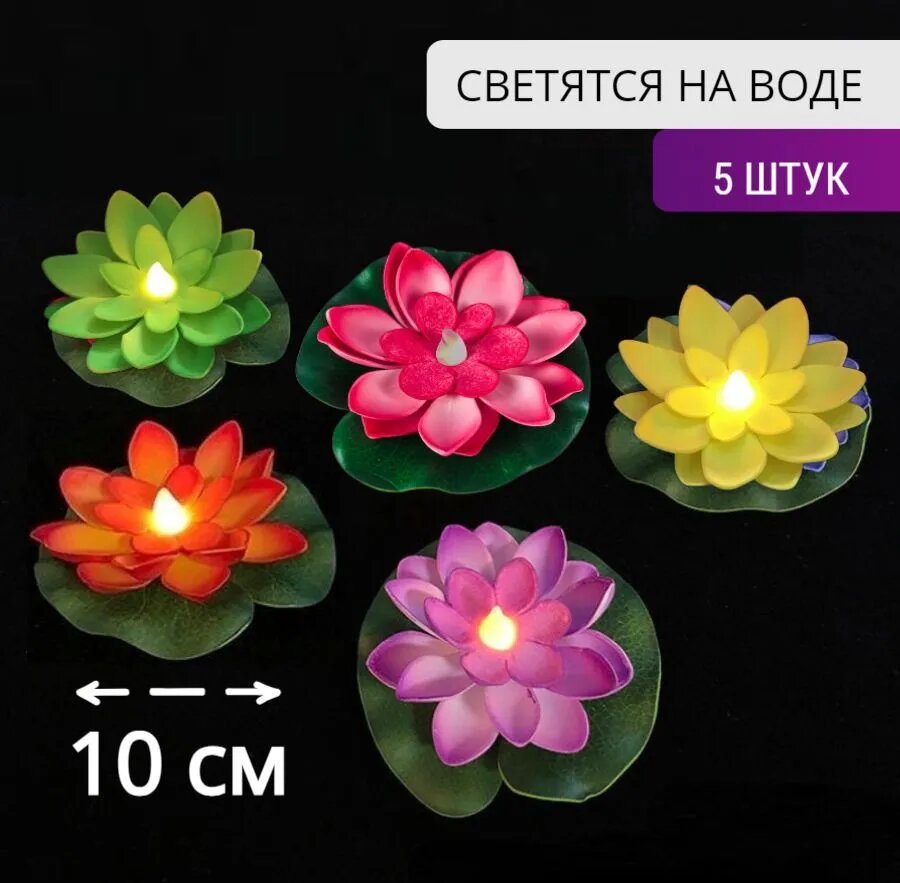 Купить Фигурка садовая кувшинка набор 5 шт, светящаяся от контакта с водой, диаметр 10 см, водоплавающая лотос, лилия 5 разных цветов
