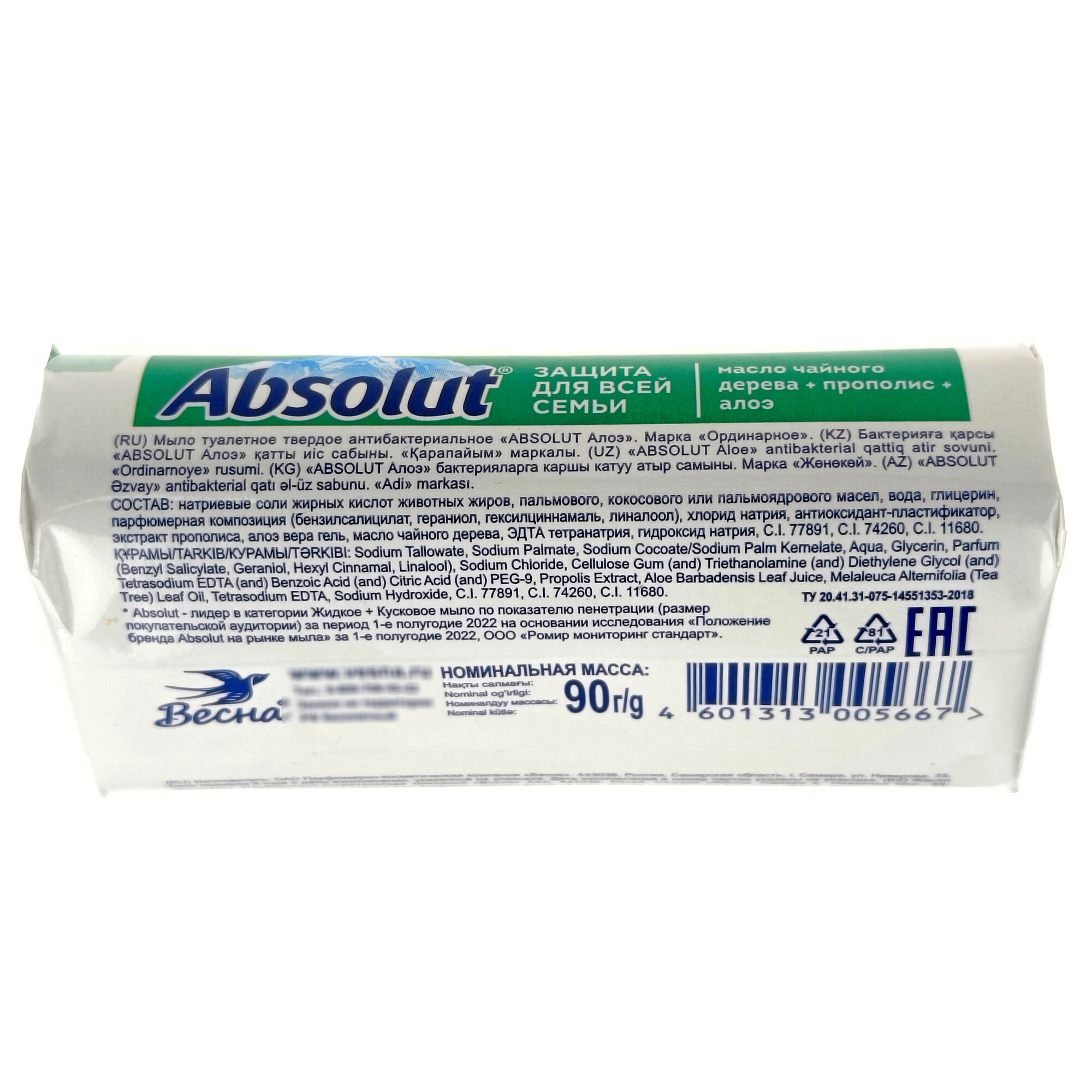 Мыло туалетное Absolut "Алоэ", антибактериальное, бумажная обертка, 90г (арт. 260881)