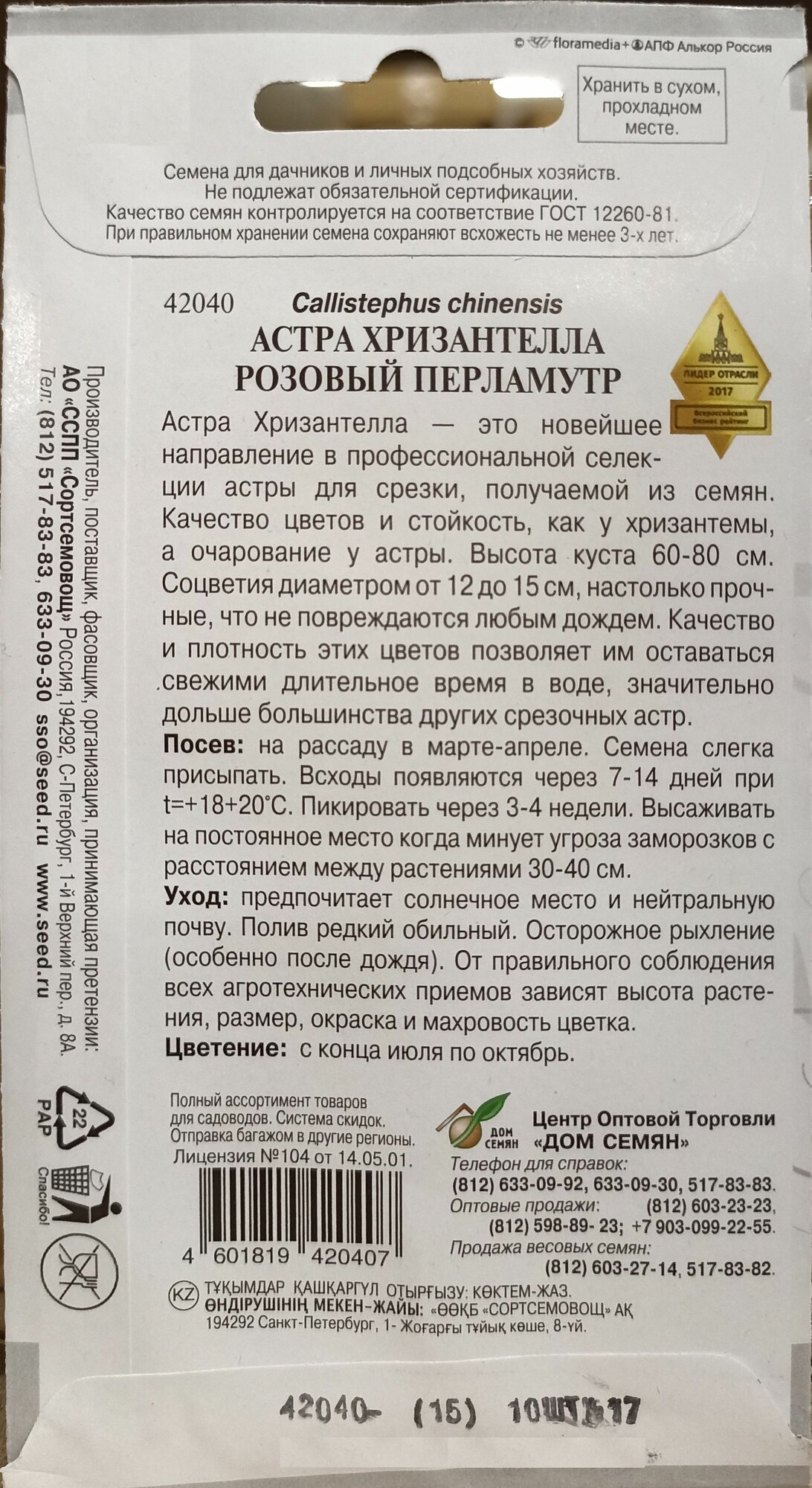 Ниже Вы можете прочитать отзывы на Астра Хризантелла Розовый Перламутр, новейшая селекция на срезку: качество хризантемы и очарование астры, 10 семян, ознакомится с подробными характеристиками, посмотреть интересные обзоры и фотографии на Астра Хризантелла Розовый Перламутр, новейшая селекция на срезку: качество хризантемы и очарование астры, 10 семян.