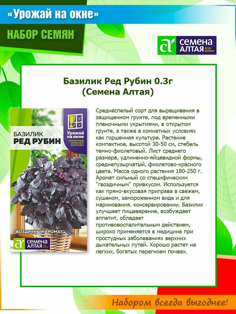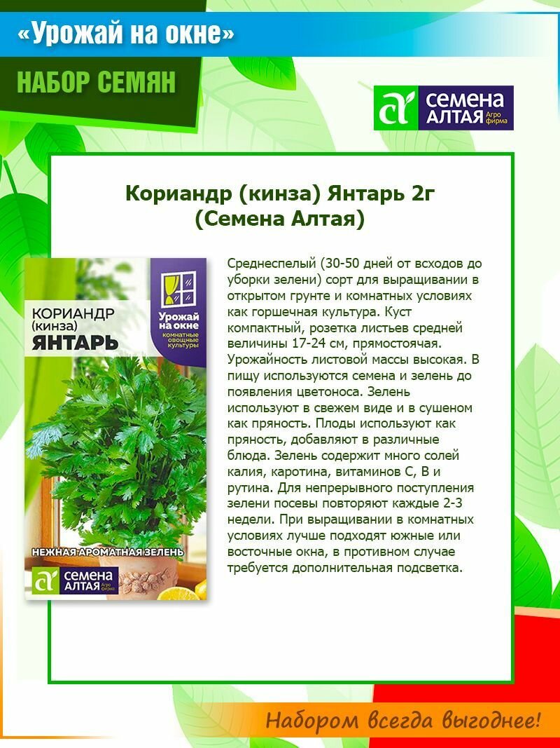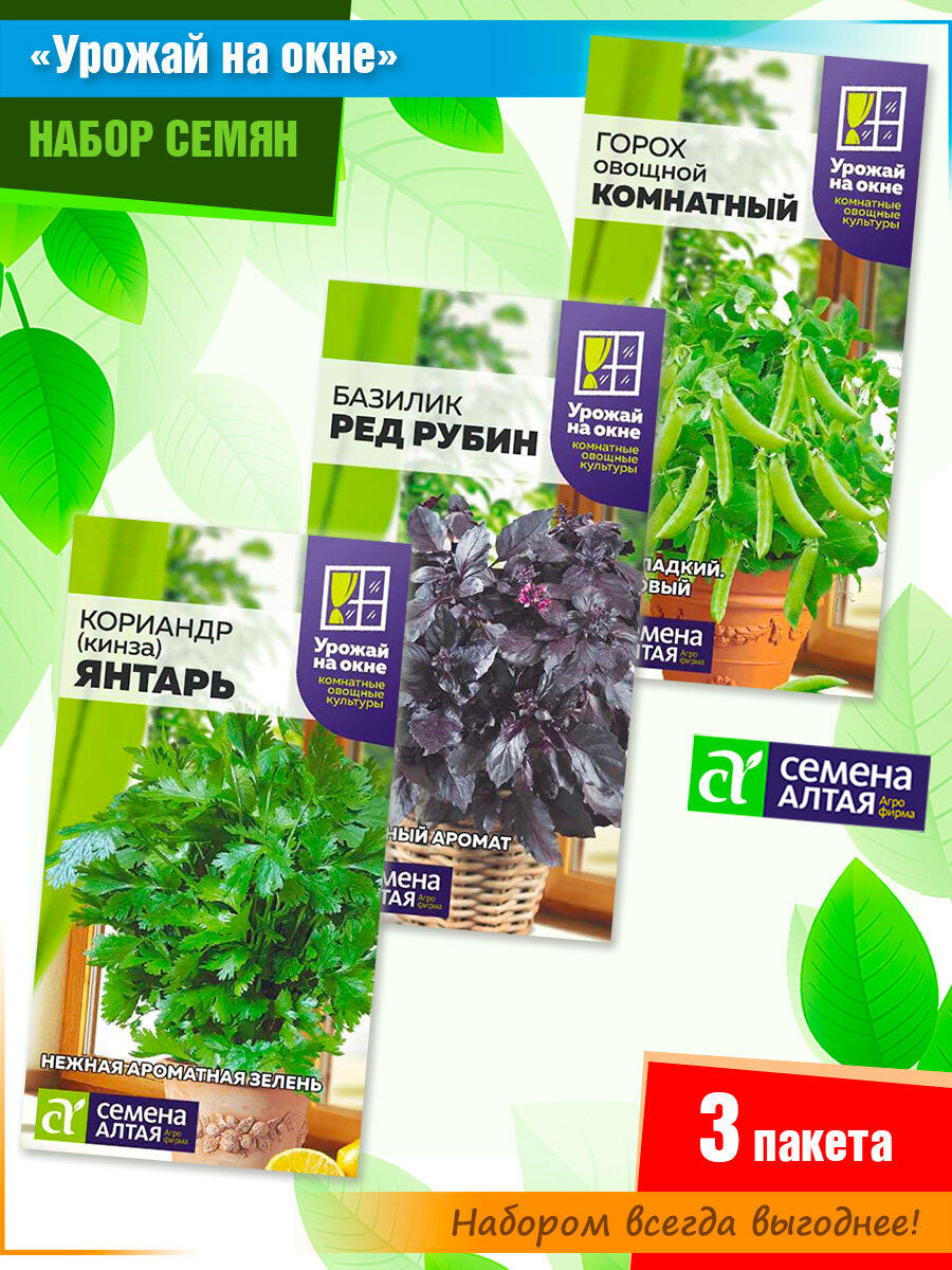 Набор семян "Урожай на окне": кориандр (кинза) Янтарь, базилик Ред Рубин, горох Комнатный от Семена Алтая (3 пачки) интересное: