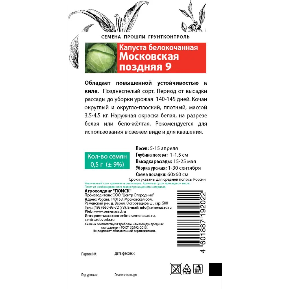 СохранитьКапуста белокочанная Московская поздняя 9 0.5 г интересное: