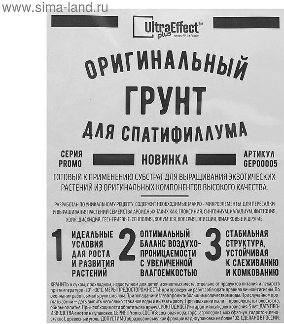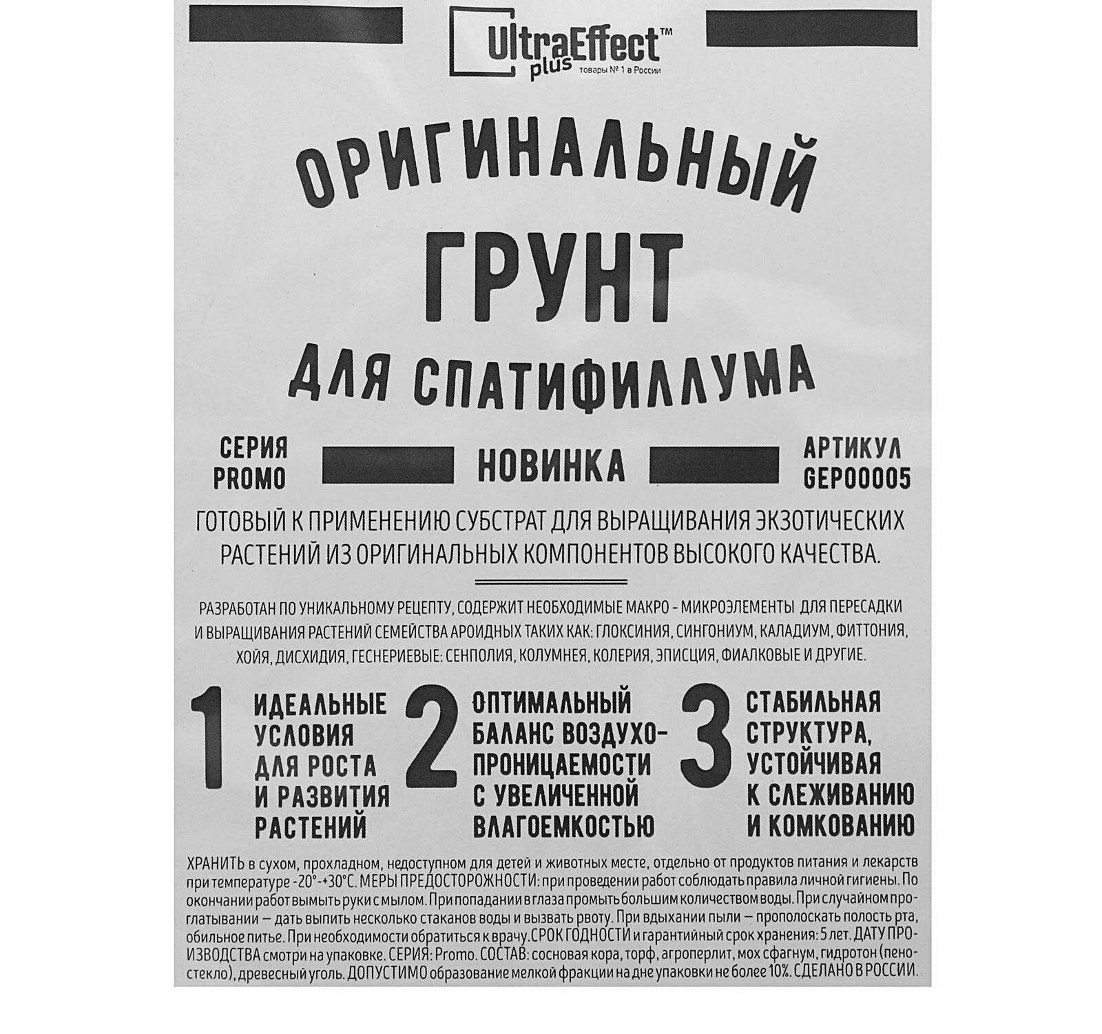 | Состав | Грунт UltraEffect Plus оригинальный для спатифиллума, 2 л, 2 кг |