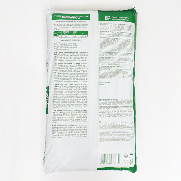 | Состав | Грунт Щедрая Земля универсальный, 60 л, 20.3 кг |