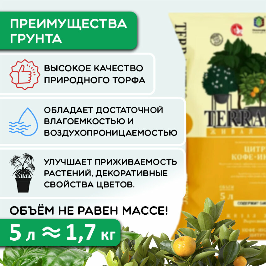 | Состав | Terra Vita Набор для для Пальмы, Фикуса и Драцены: почвогрунт 5л, удобрение органическое 330 мл, дренаж 1л |