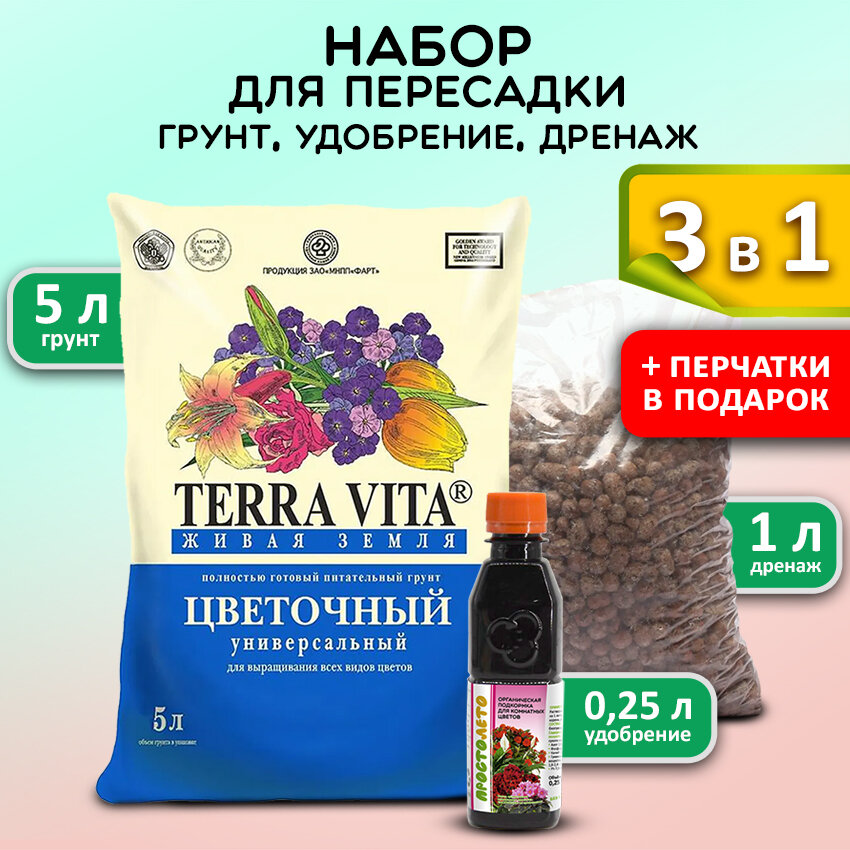 СохранитьTerra Vita Набор для пересадки комнатных растений и цветов: почвогрунт универсальный 5 л, удобрение 250 мл, дренаж 1 л интересное:
