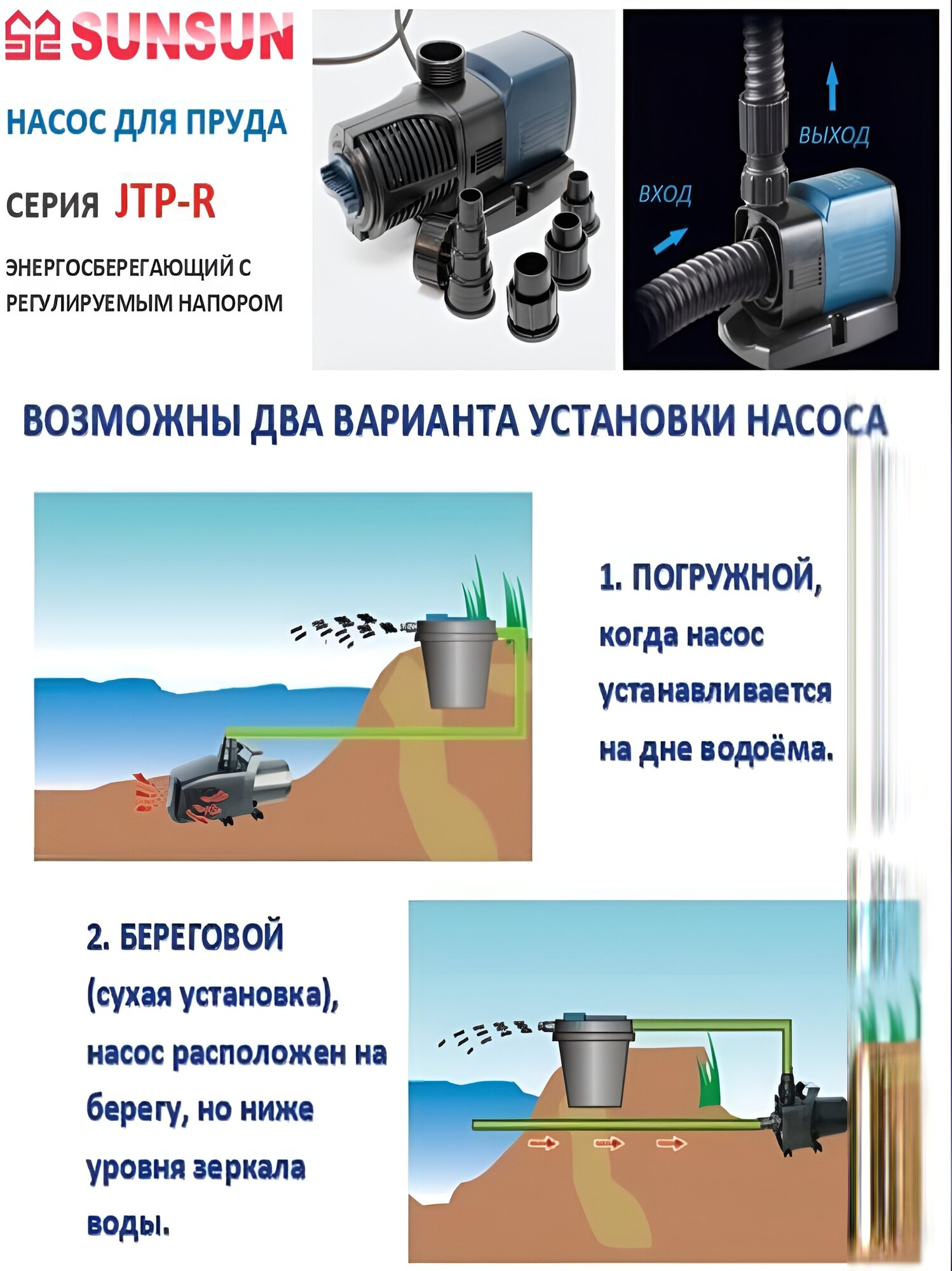 | Дополнительная информация | Помпы SunSun серии JTP могут использоваться как в пресной, так и в морской воде, что говорит о их высочайшей надёжности. |
