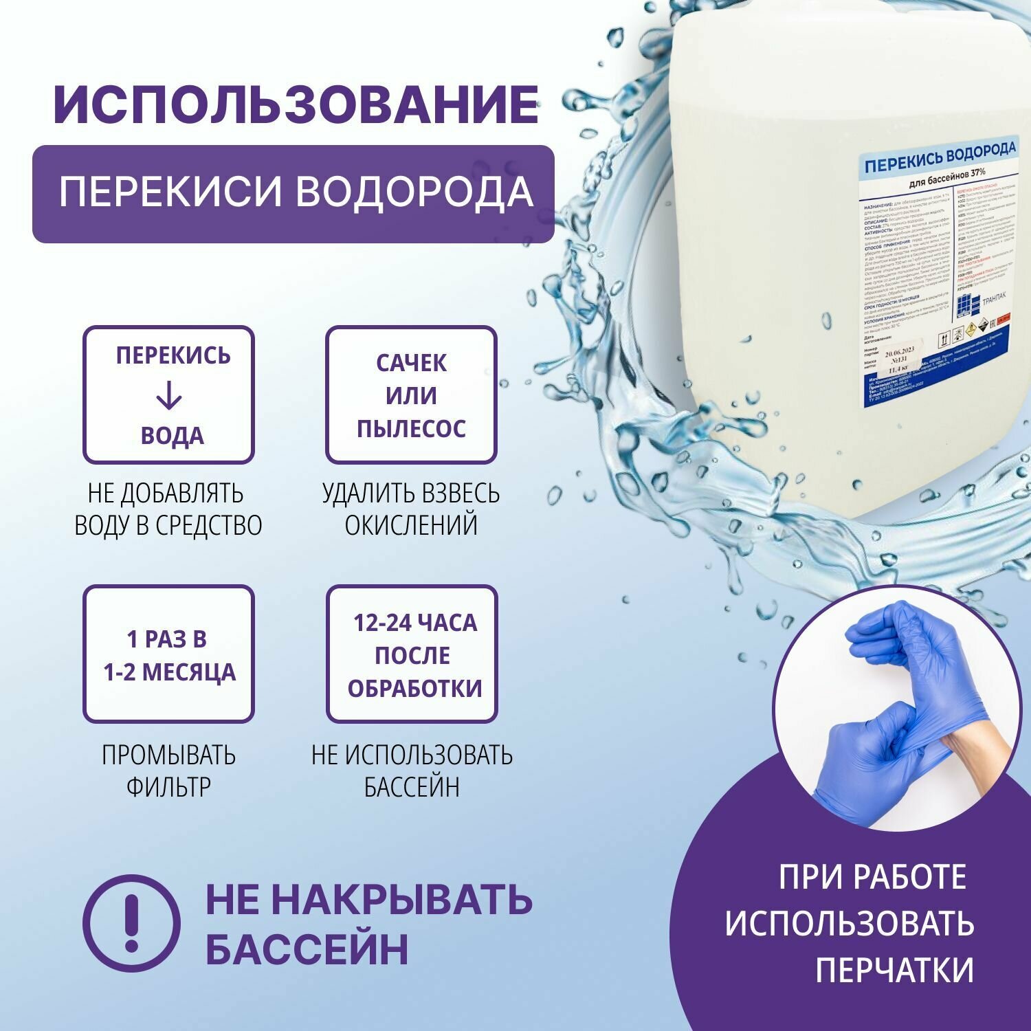 | Дополнительная информация | Перекись водорода 37% антисептик и противогрибковое средство для дезинфекции,, с пробкой. Обладает мощной антимикробной активностью. Воздействие перекиси водорода позволяет качественно очистить воду в бассейне, придать ей прозрачность, а также обработать стенки бассейна, фонтана. Отличное средство для отбеливания тканей, стерилизации изделий медицинского назначения, а так же любых поверхностей в помещениях. Применяется для проращивания микрозелени, и для уничтожения грибка у растений. Использовать в перчатках, (1 пары в комплекте). Мы продаем только свежую перекись, марки А. |