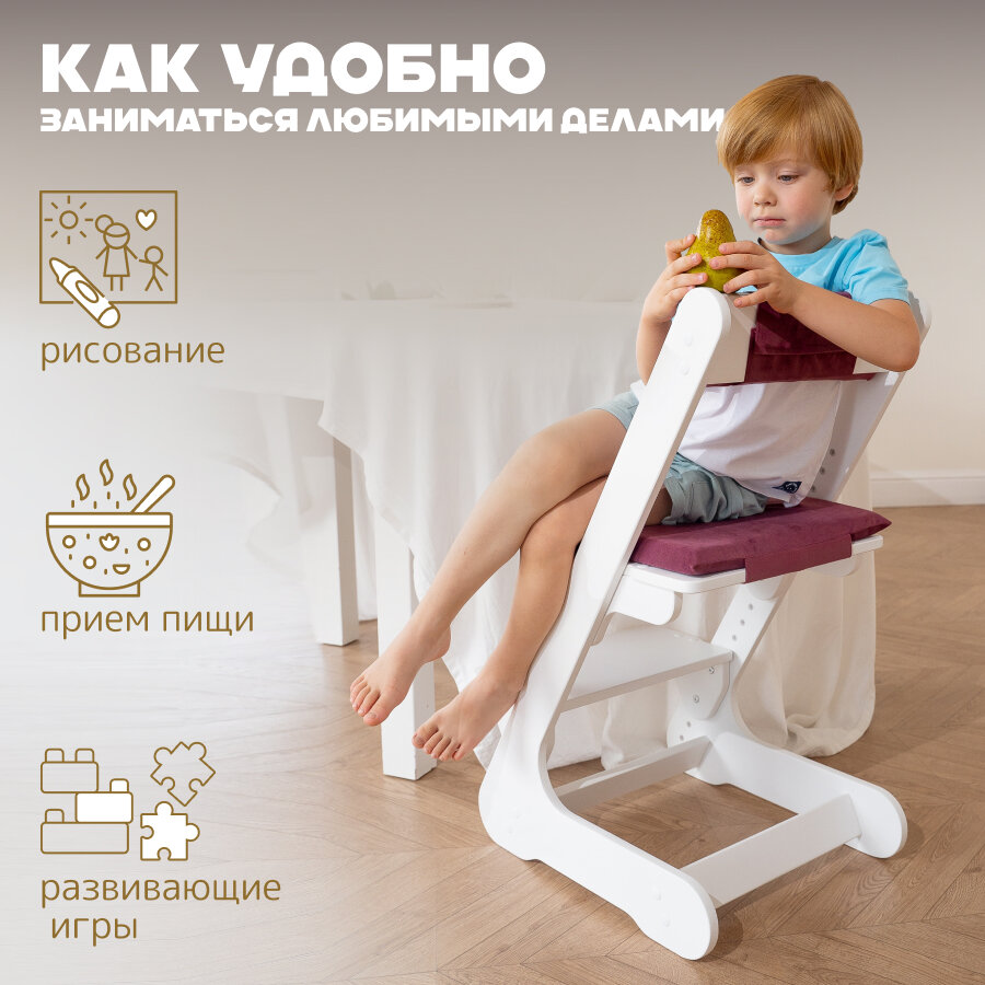 Растущий стул для детей белый с бордовой подушкой