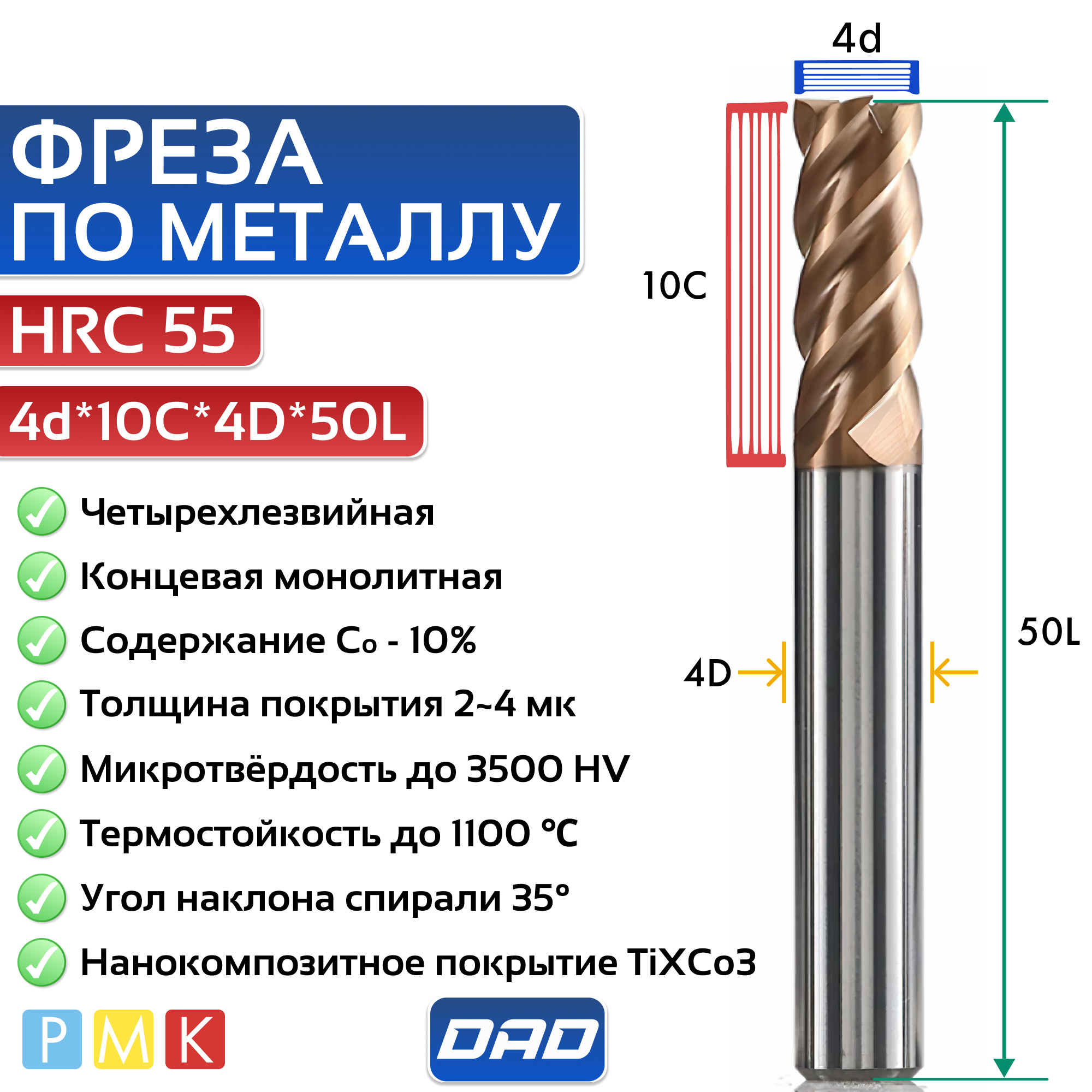 Купить Фреза по металлу концевая 4d*10C*4D*50L*4F HRC55 монолитная твердосплавная с нанокомпозитным покрытием TiXCo3