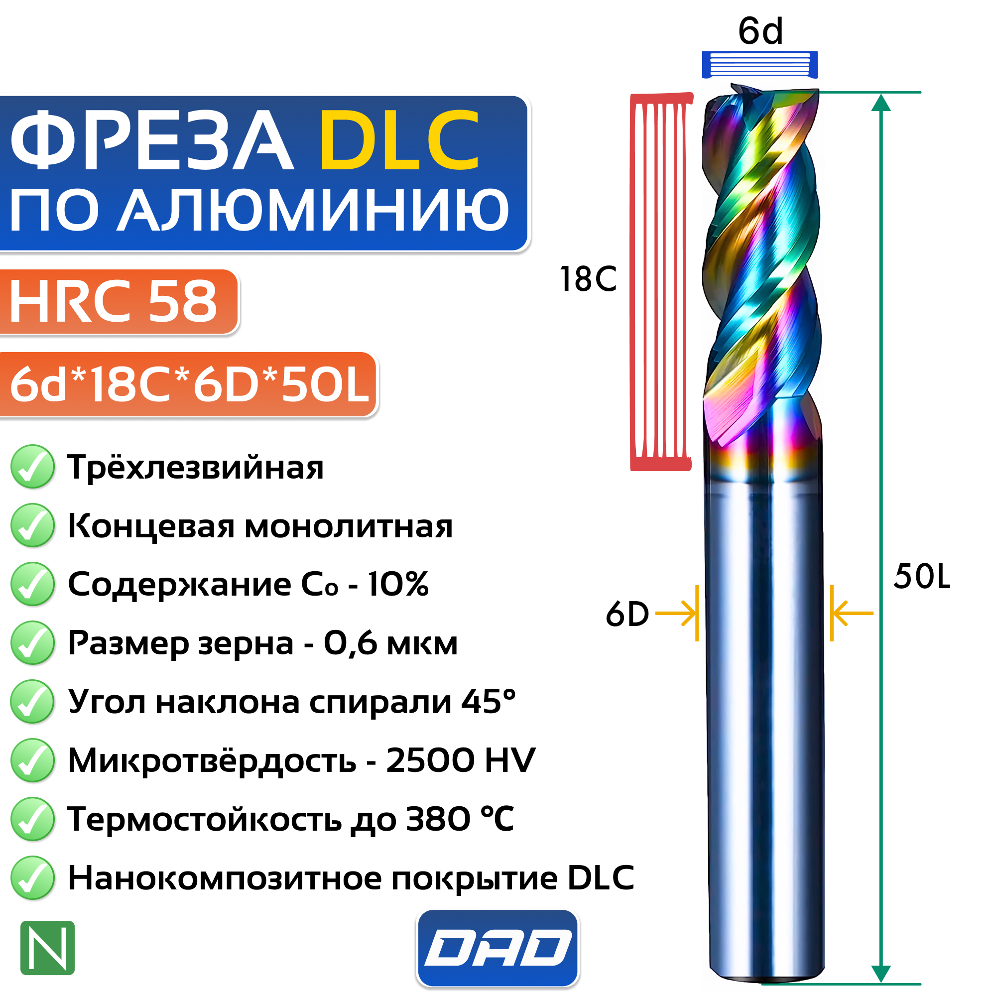 Купить Фреза по алюминию концевая 6d*18C*6D*50L*3F HRC58 монолитная сверхтвёрдая с нанокомпозитным напылением nACo