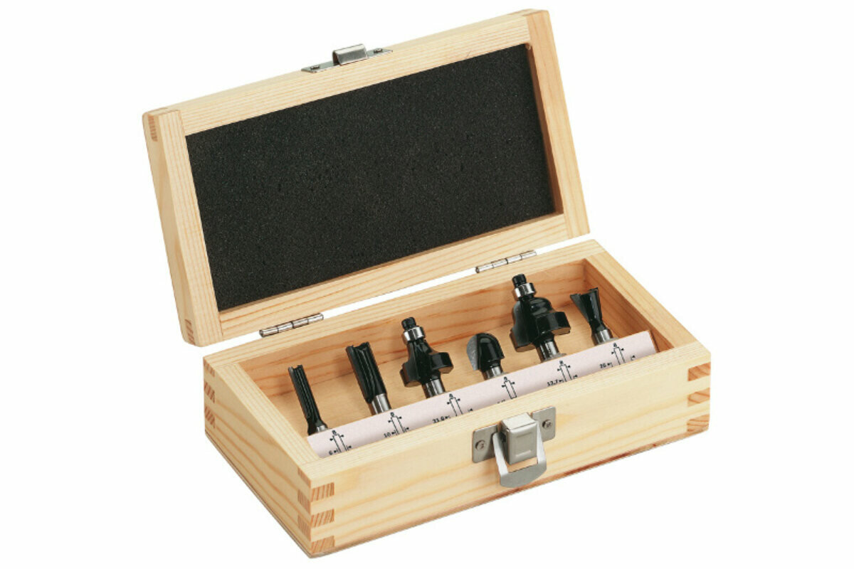 | Комплектация | 3 шт пазовая прямая 1/2'', 1/4'', 3/8''; 1 шт фасочная R5/32''; 1 шт V-образная 90 град. 3/8''; 1 шт калевочная R1/4''; 1 шт шестигранный ключ 2,5мм; пластиковый кейс. |