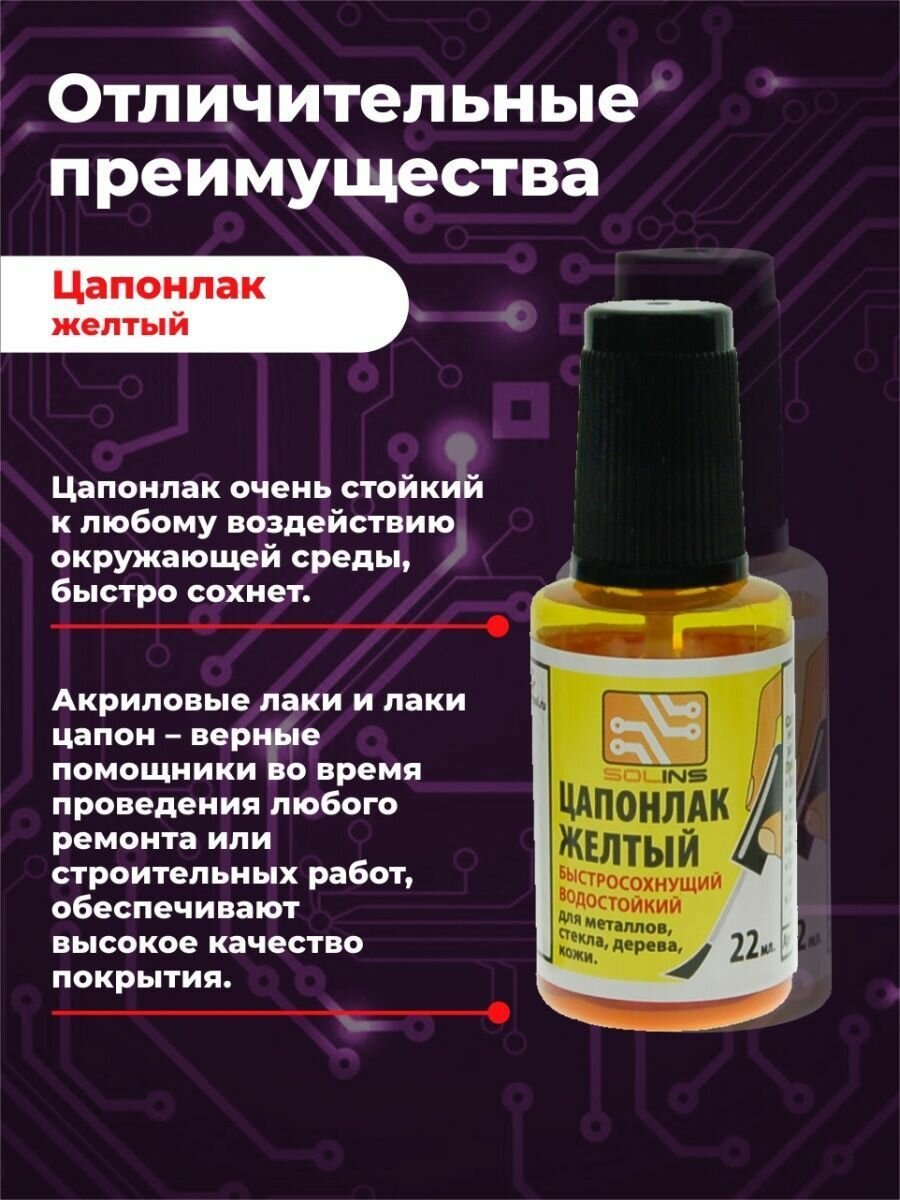 Цапон лак Solins быстросохнущий водостойкий, защитный для металла, стекла (ламп), дерева (древесины), кожи, печатных плат, цапонлак защита от коррозии для наружных и внутренних работ, фиолетовый 22 мл