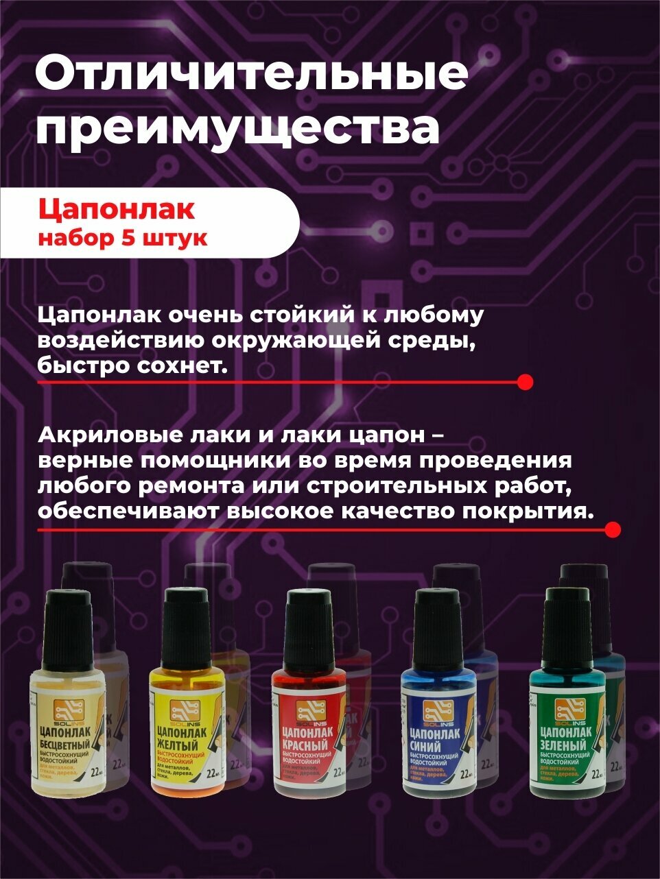 Цапон лак Solins быстросохнущий водостойкий, защитный для металла, стекла ламп, дерева, печатных плат / Цапонлак защита от коррозии для наружных и внутренних работ, фиолетовый набор 3 шт. по 22 мл