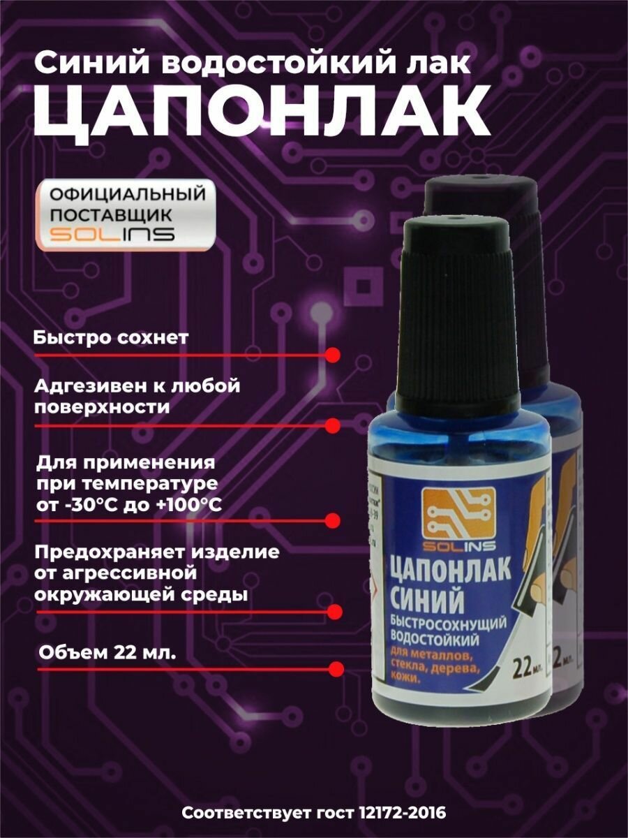 Цапон лак Solins быстросохнущий водостойкий, защитный для металла, стекла (ламп), дерева (древесины), кожи, печатных плат, цапонлак защита от коррозии для наружных и внутренних работ, синий 22 мл